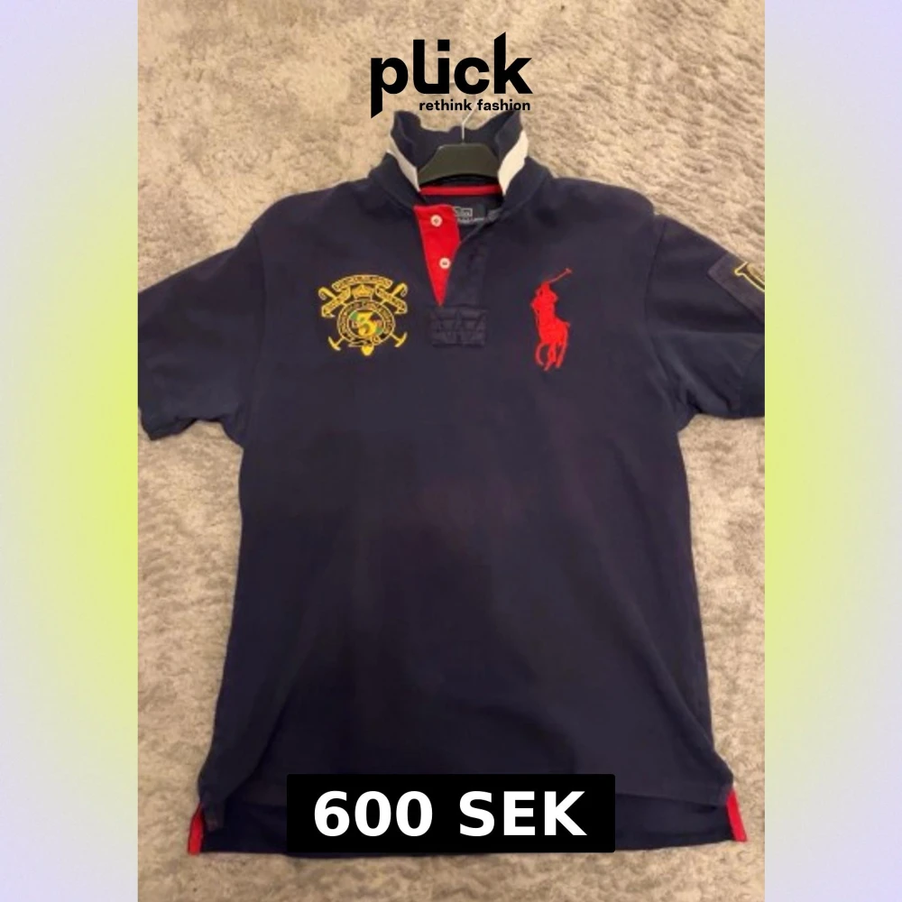 Snygg mörkblå pikétröja från Polo Ralph Lauren i storlek XL. Tröjan har röda och gula broderade detaljer, vit rand på kragen och röd knappslå. Tillverkad i 100% bomull, med korta ärmar och klassisk polo-look. Perfekt för dig som gillar sportig och stilren design.