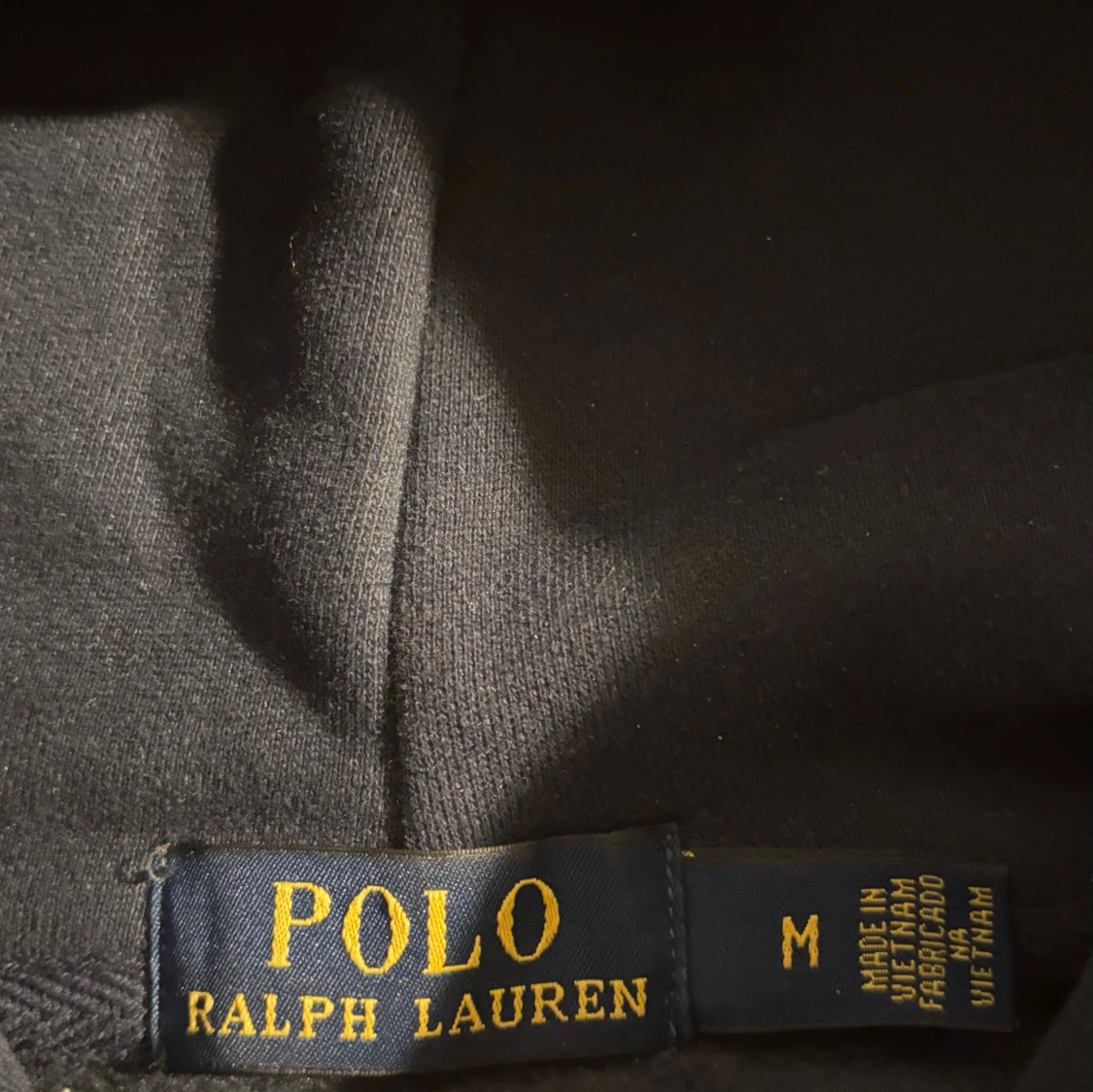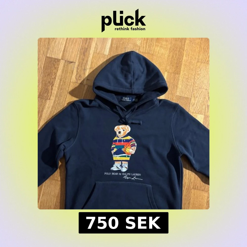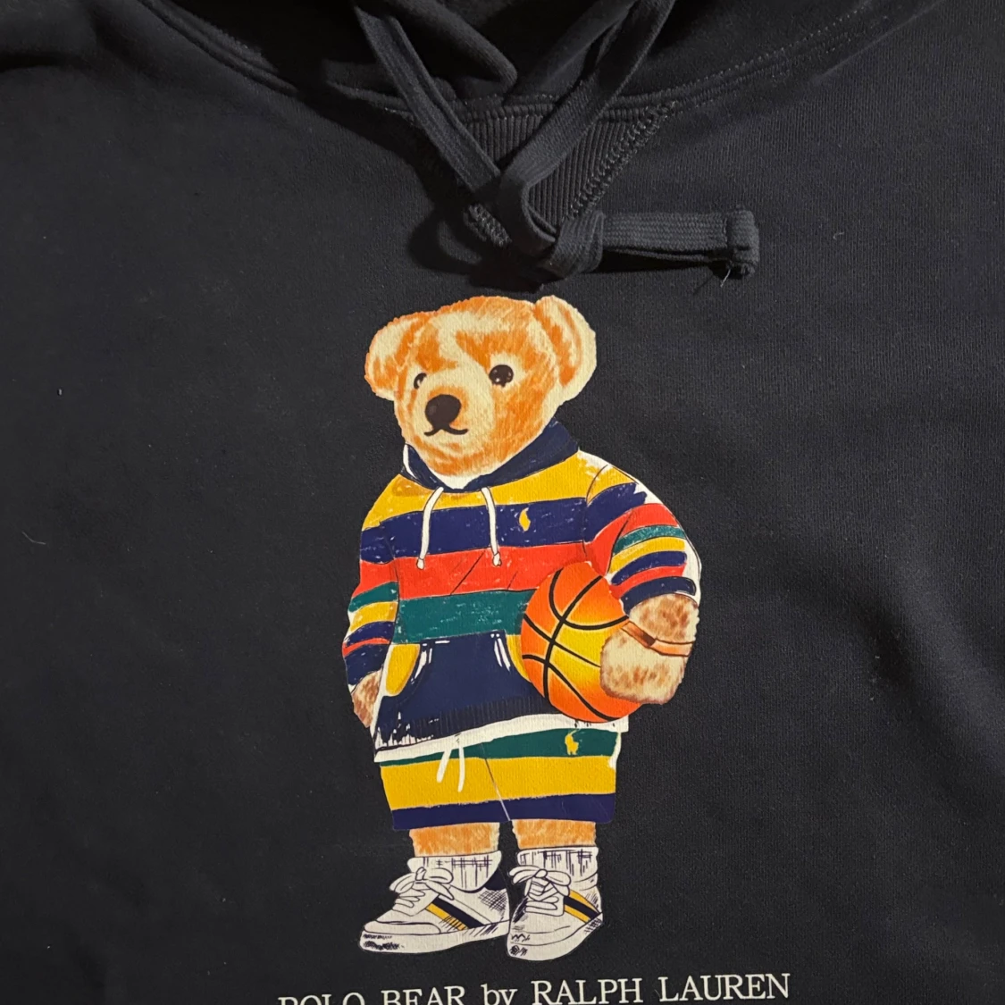 Säljer en mörkblå hoodie från Polo Ralph Lauren med ikoniska Polo Bear-trycket på bröstet. Tröjan har huva med snörning och känguruficka. Björnen på framsidan har en färgglad randig tröja och håller en basketboll. Perfekt statement-plagg för dig som gillar streetstyle.