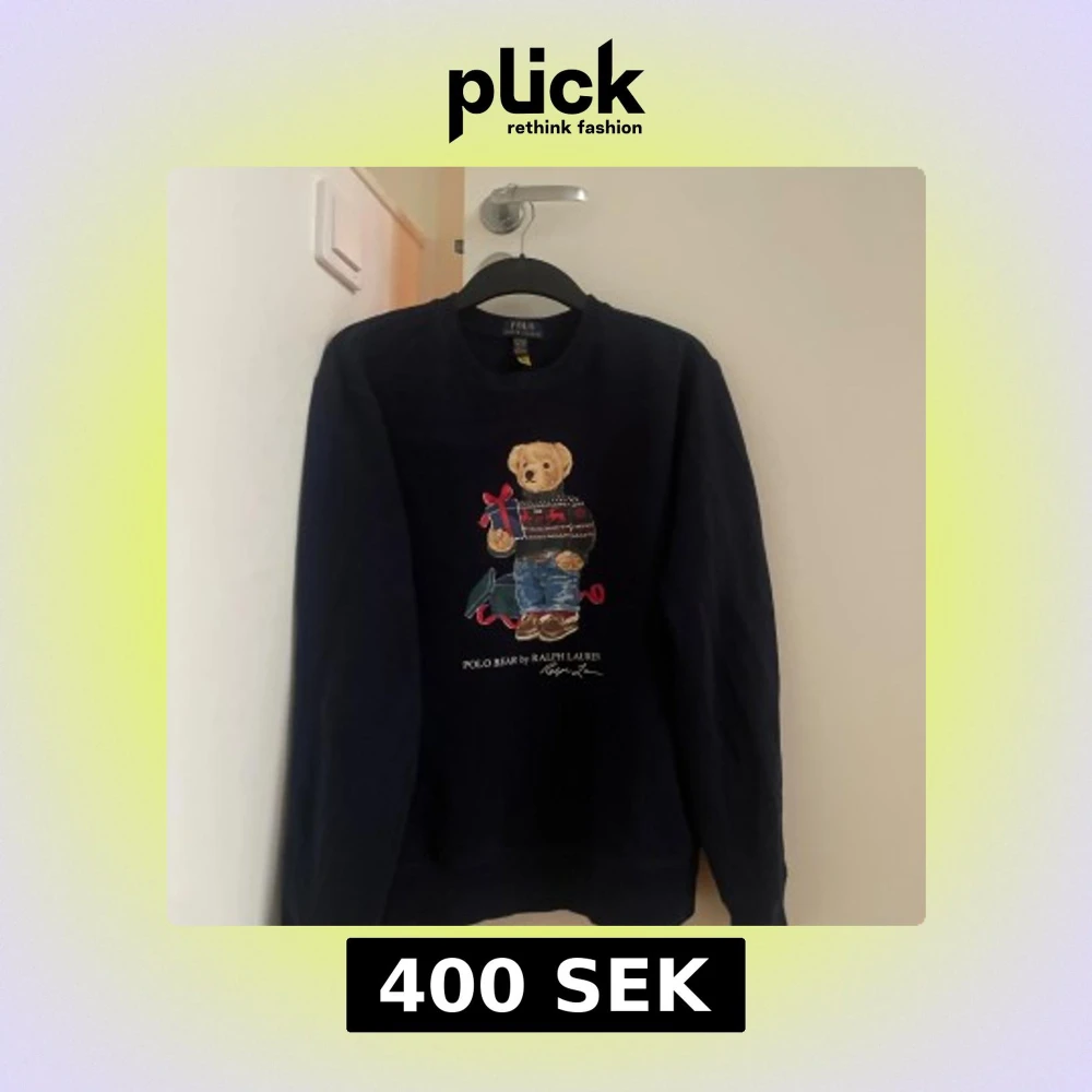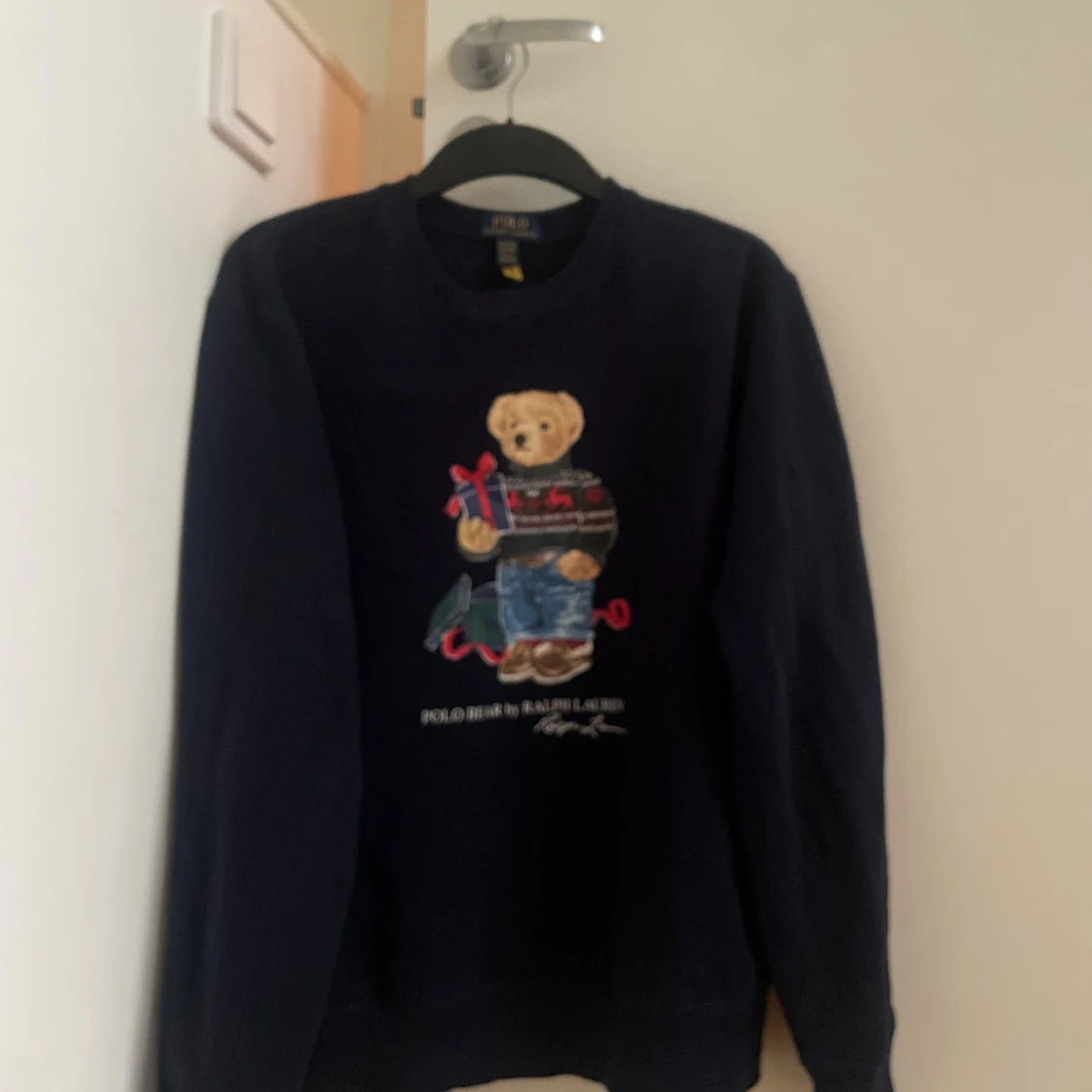Säljer en mörkblå sweatshirt från Ralph Lauren med ikoniska Polo Bear-trycket framtill. Björnen har stickad tröja, jeans och håller ett paket med röd rosett. Tröjan har rund hals och långa ärmar, perfekt för dig som vill ha en klassisk men lekfull stil. Storlek Xl barn men passar även storlek S