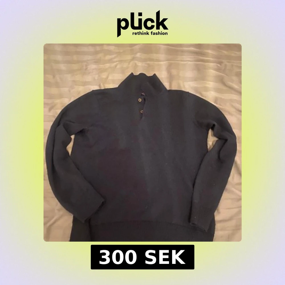 Säljer en stilren mörkblå polotröja med knappar. Tröjan har långa ärmar och ribbstickade muddar vid ärmslut och nederkant. Perfekt för kyliga dagar. Storlek M men krympt lite så sitter mer som S