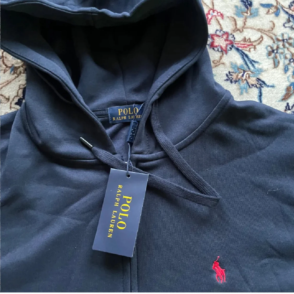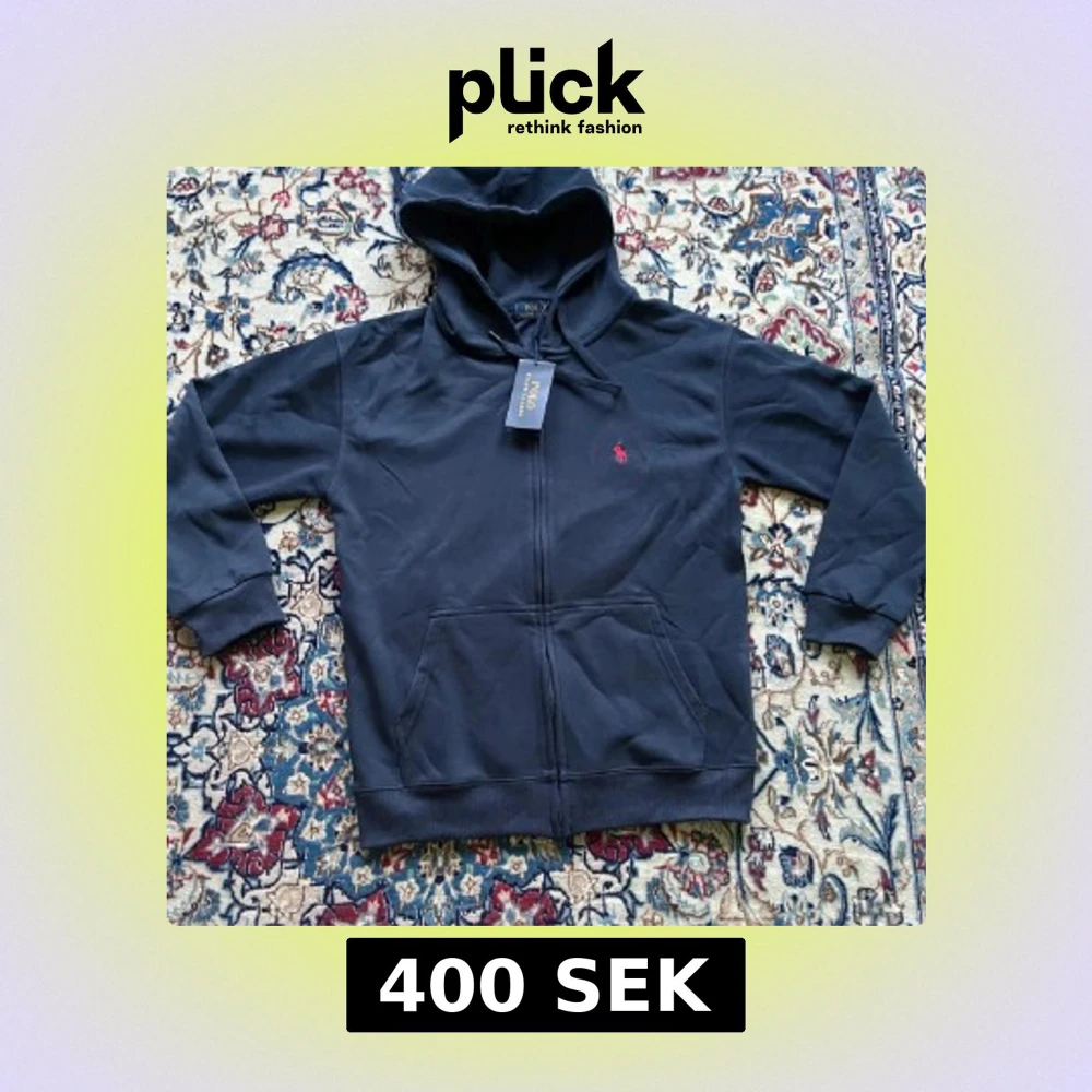 Mörkblå hoodie från Polo Ralph Lauren med dragkedja. Bilderna tog jag när jag köpte tröjan men nu är den inte kvar! Bra skick 9/10 inte använt mycket. Storlek M passar även S.