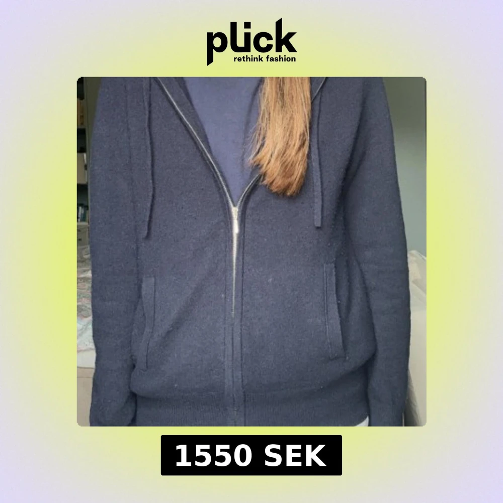 Mörkblå hoodie med huva och snörning, hel dragkedja framtill och två fickor. Tröjan har lång ärm och är tillverkad i ett mjukt stickat material som känns skönt mot huden.