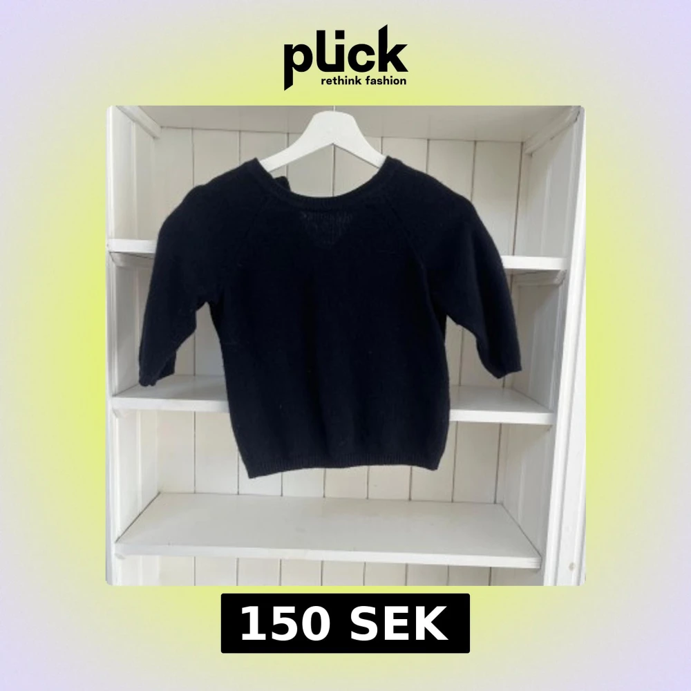 Säljer en svart stickad tröja med rund hals och halvlånga ärmar. Modellen är croppad och har en enkel, stilren look som funkar perfekt nu till hösten 😇