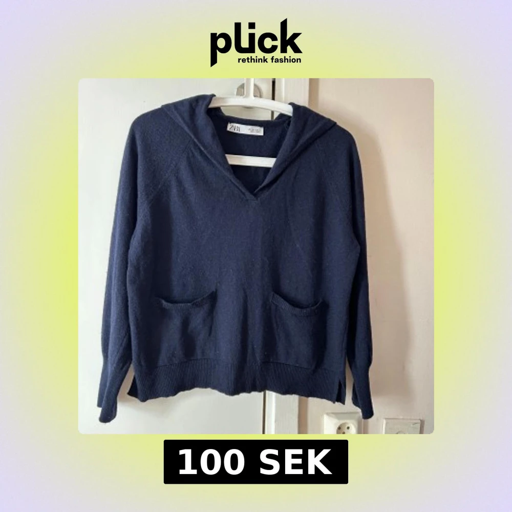 Mysig mörkblå stickad hoodie från Zara med två framfickor och ribbade muddar. Tröjan har en avslappnad passform, lång ärm oPerfekt för kyliga dagar när du vill vara både bekväm och snygg.