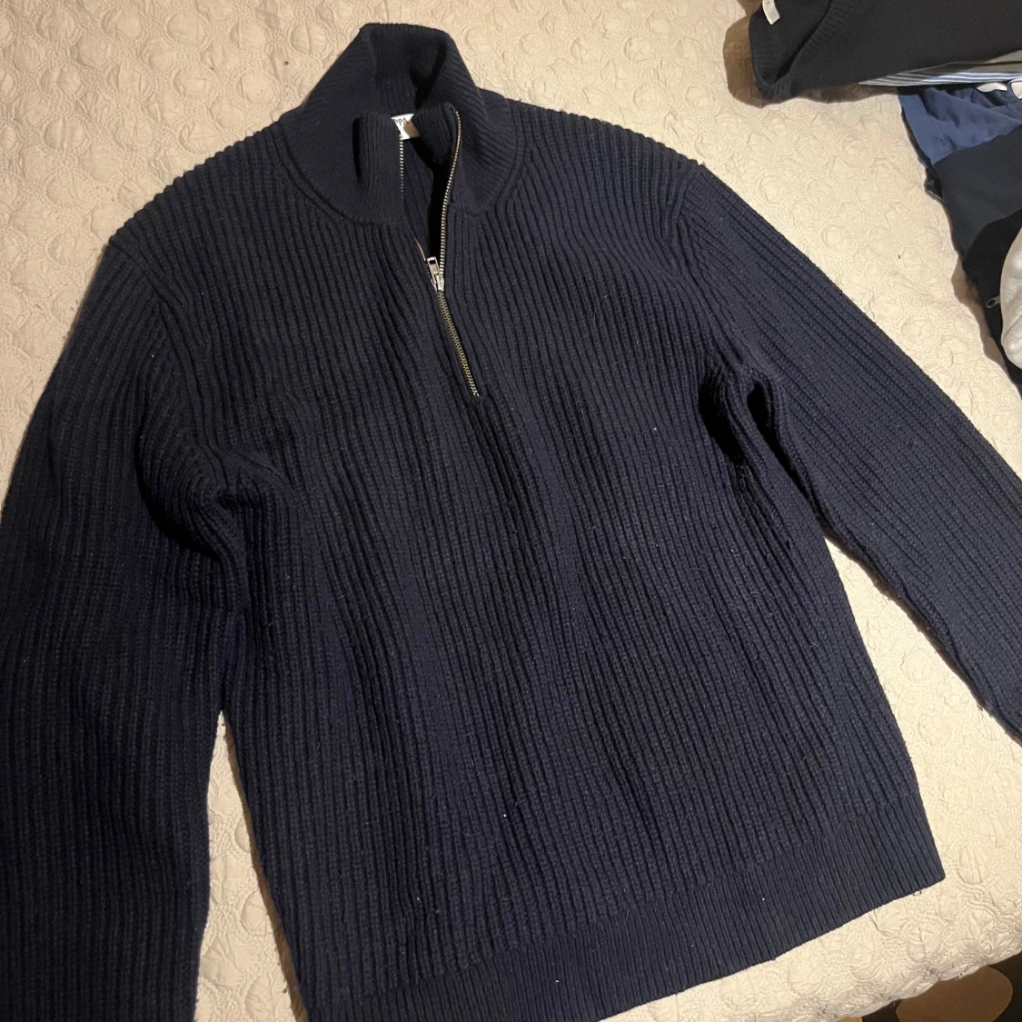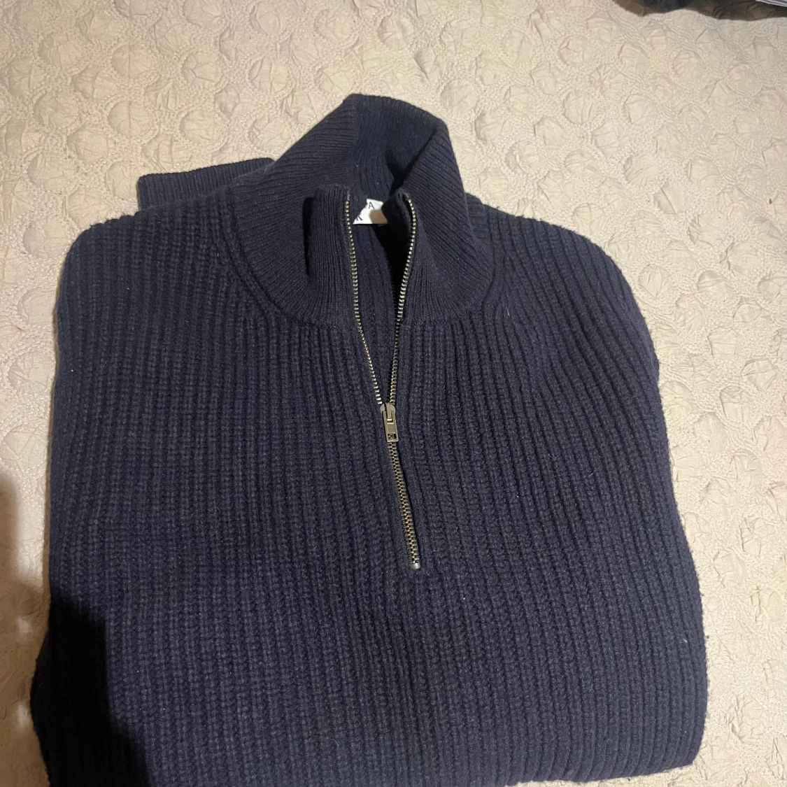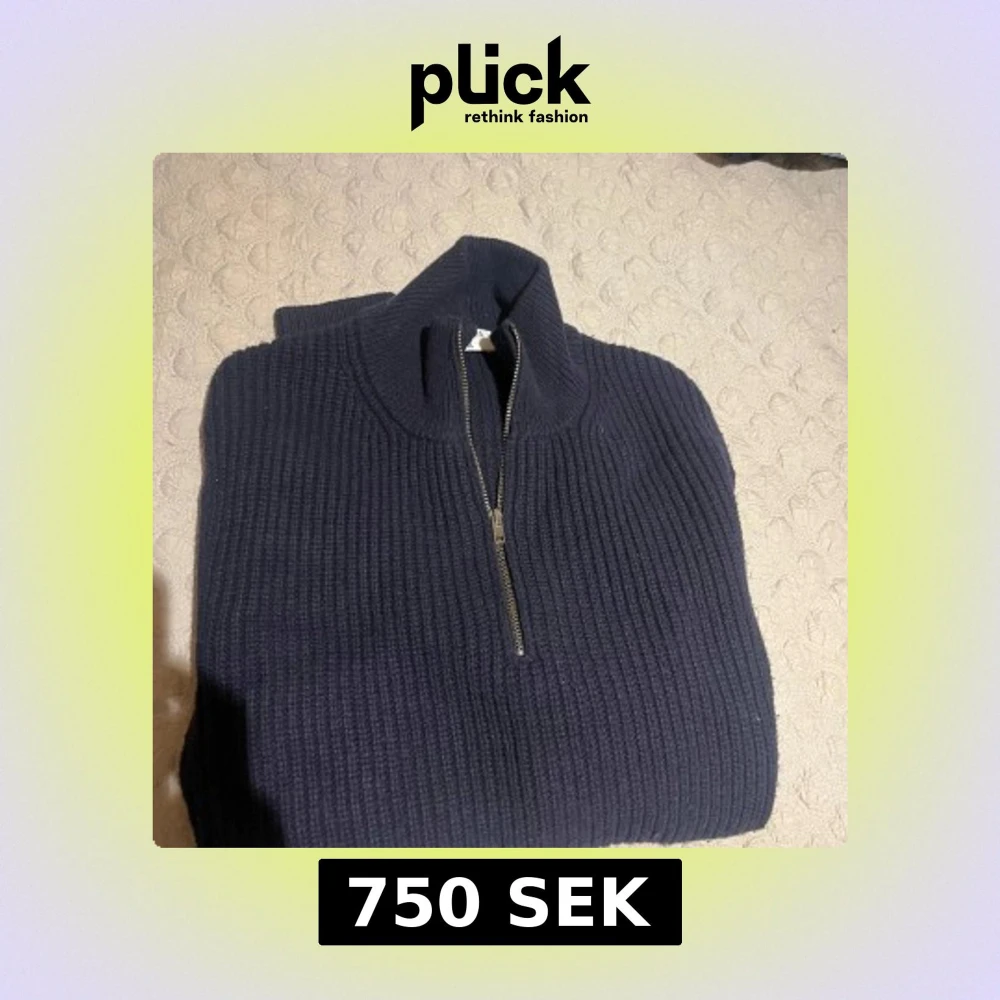 Säljer en mörkblå stickad tröja från FILIPPA K med ribbad struktur och half zip-dragkedja. Tröjan har hög krage och långa ärmar, perfekt för kyliga dagar. Enkel och stilren design som funkar till det mesta. 7.5/10 finns ett litet hål under ärmen som kan behöva lagas retail 2400kr heavy knit