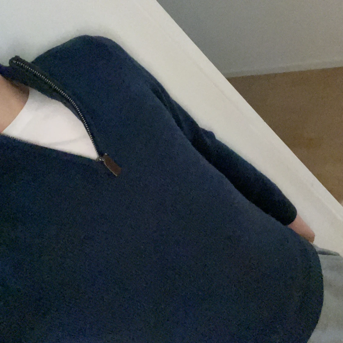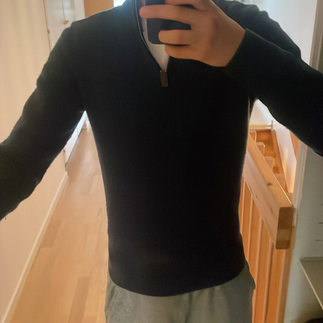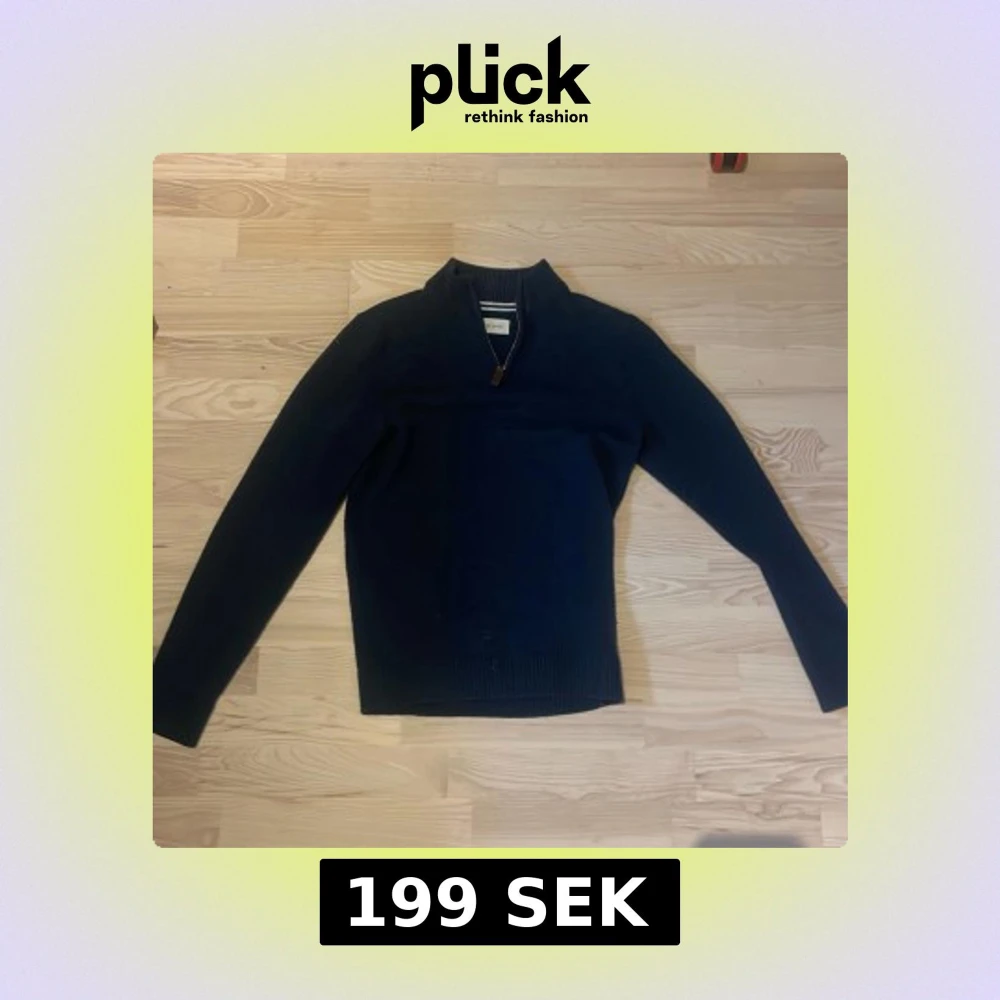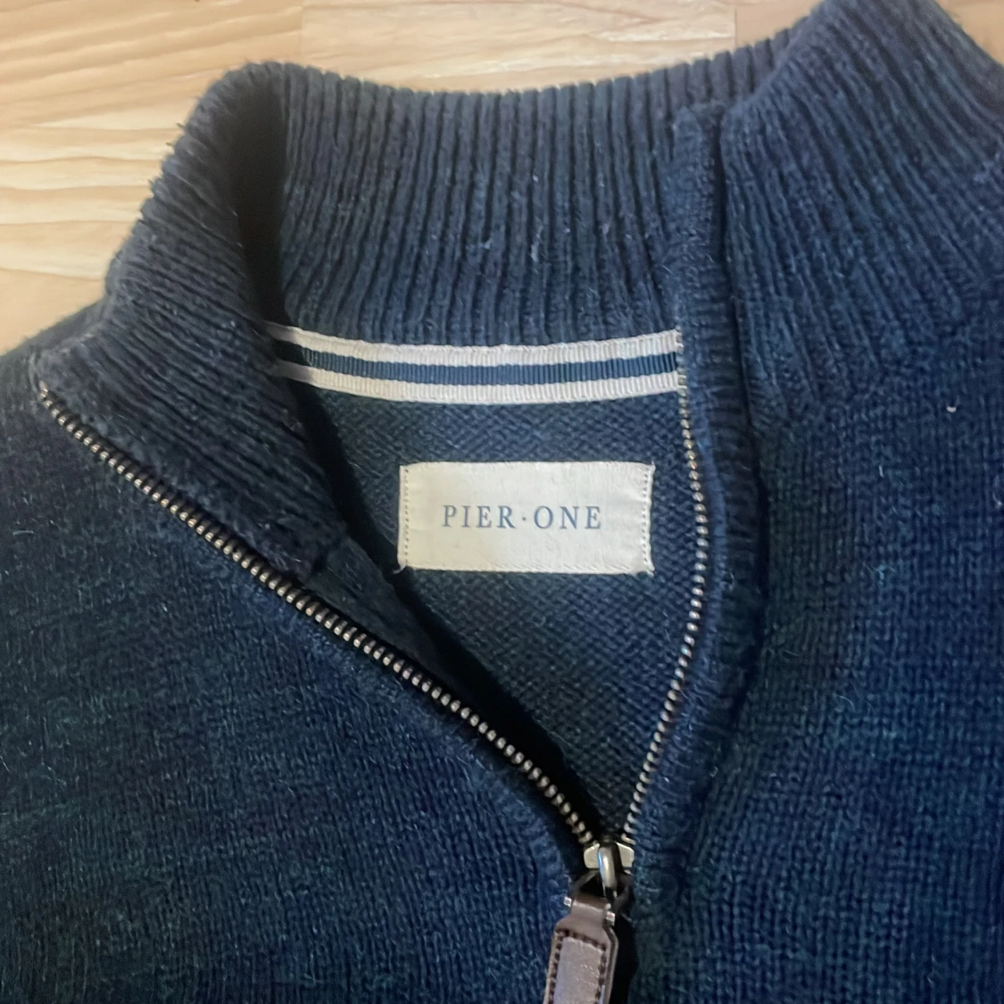 Mörkblå stickad tröja från Pier One med half zip-dragkedja och hög krage. Tröjan har lång ärm och ribbade muddar vid hals, ärmslut och nederkant. Perfekt för lager-på-lager och chill stil.