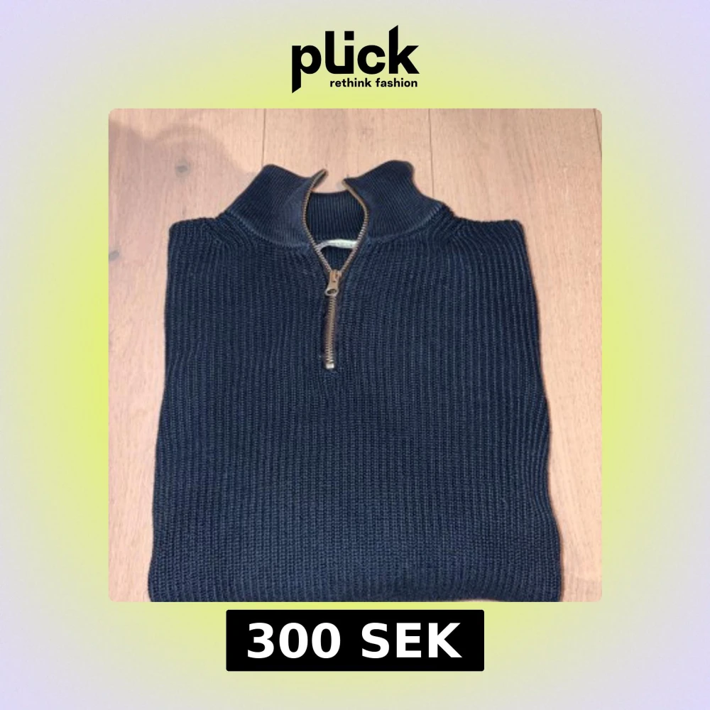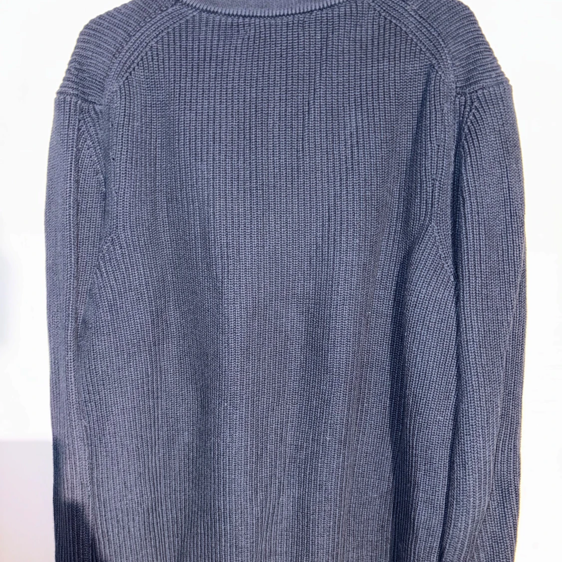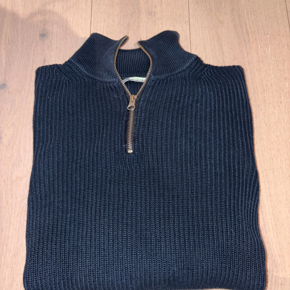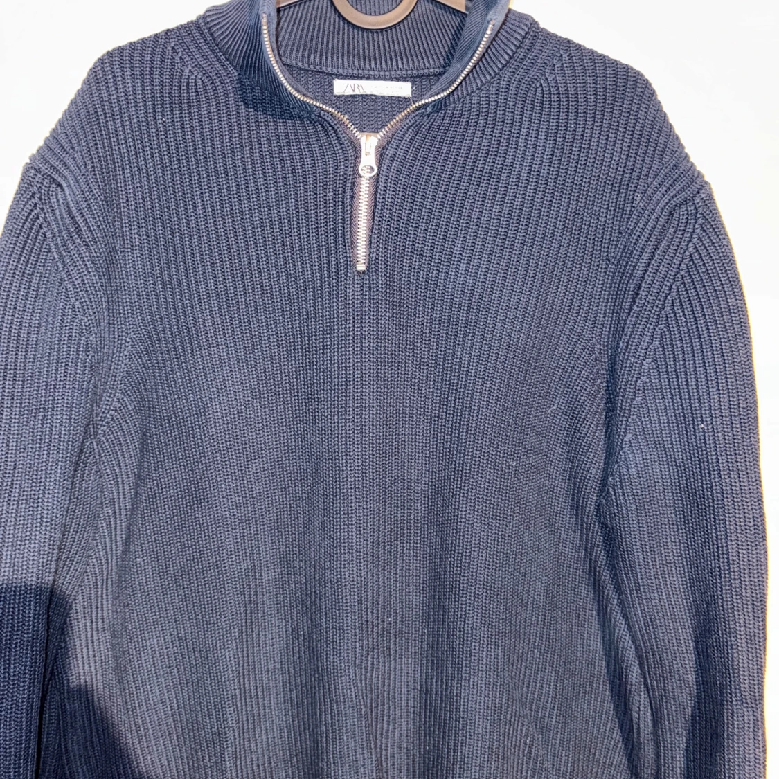 Mörkblå stickad tröja från Zara med grov ribbstickning och en snygg half zip-dragkedja vid halsen. Tröjan har hög krage och långa ärmar, perfekt för lager-på-lager under kyliga dagar.