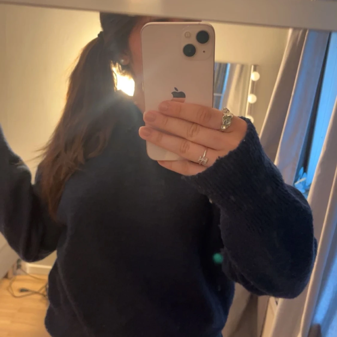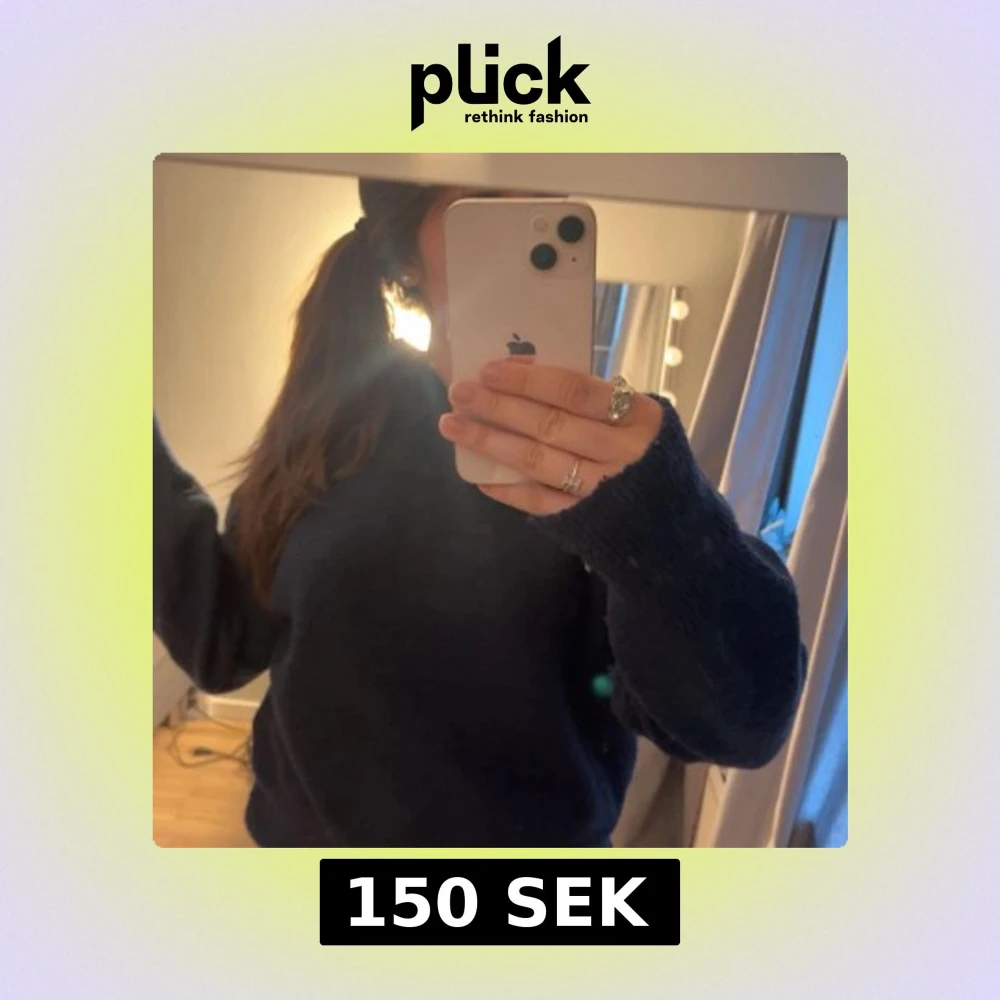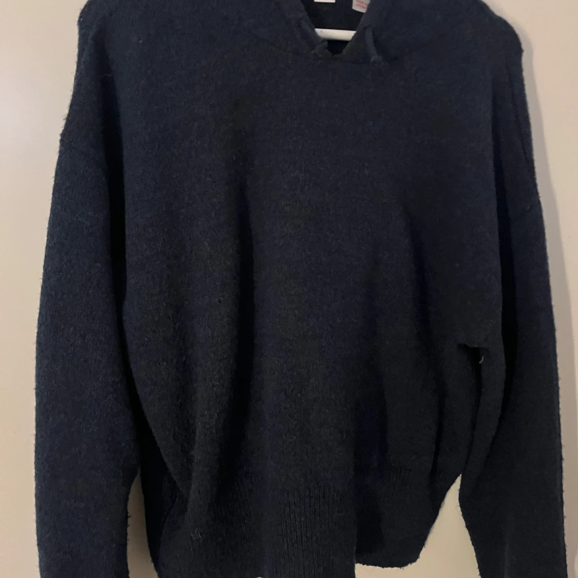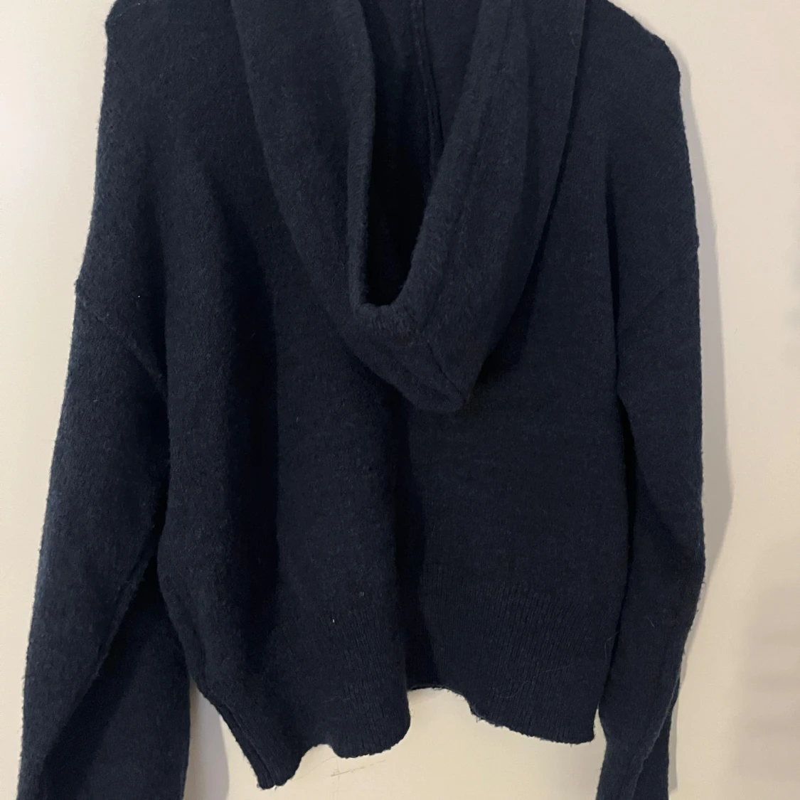 Mysig mörkblå stickad hoodie med långa ärmar och luva, köpt på gina Young storlek 170 men passar S och M