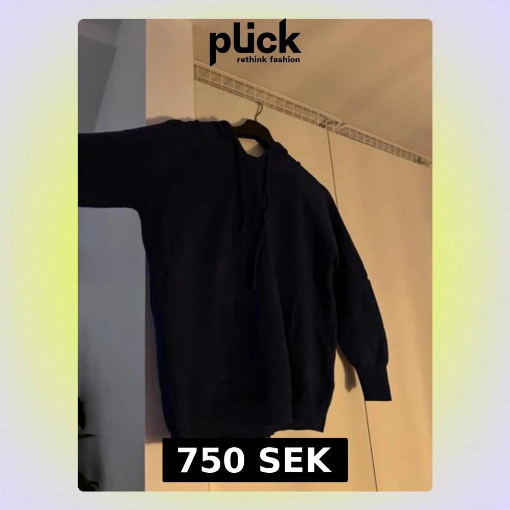 Snygg mörkblå stickad hoodie med klassisk huva och snörning. Tröjan har långärmade ärmar och en relaxed passform, perfekt för chill dagar. Materialet känns mjukt och skönt mot huden, och färgen är djup och stilren. Enkel design utan tryck eller mönster. Denna är i storlek s sitter väldigt bra och väldigt skönt, denna vara är aldrig använd däremot!