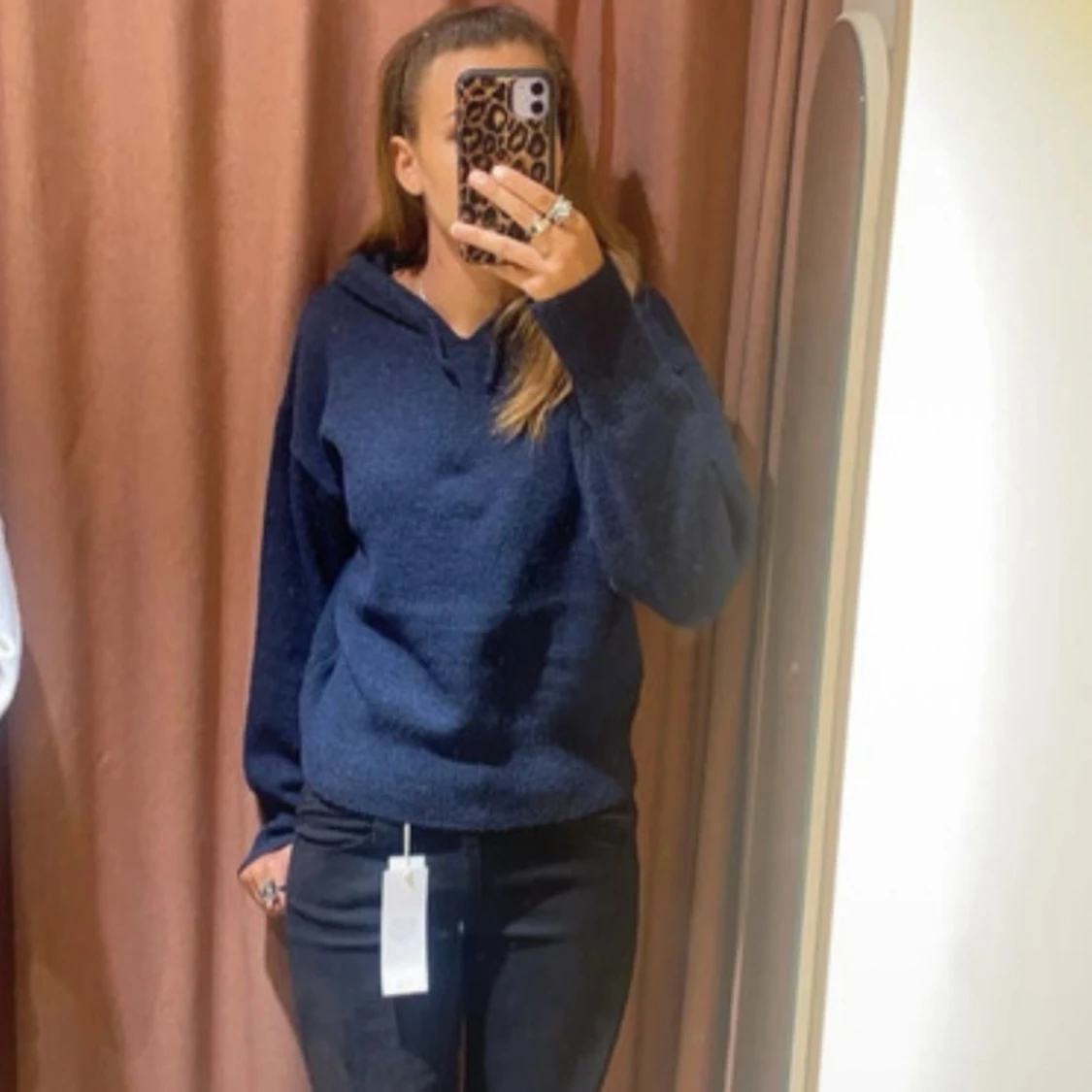 Säljer en mysig mörkblå stickad hoodie med långa ärmar och en bekväm passform. Perfekt för kyliga dagar. Hör av dig vid intresse!🩷