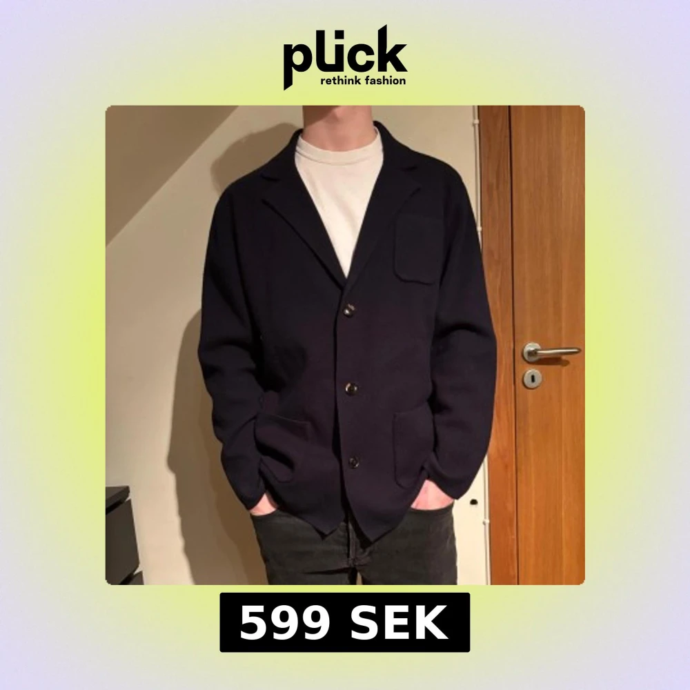 Säljer en mörkblå stickad kavaj från John Henric. Modellen är 183cm och bär storlek L
