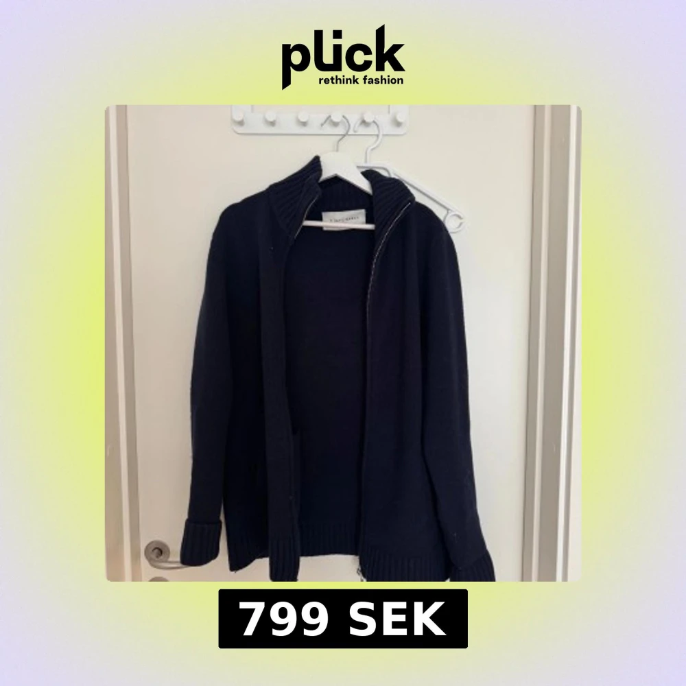 Säljer en stilren mörkblå stickad kofta från A Day's March. Koftan har en dragkedja framtill och en hög ribbad krage som ger extra värme. Perfekt för kyliga dagar.