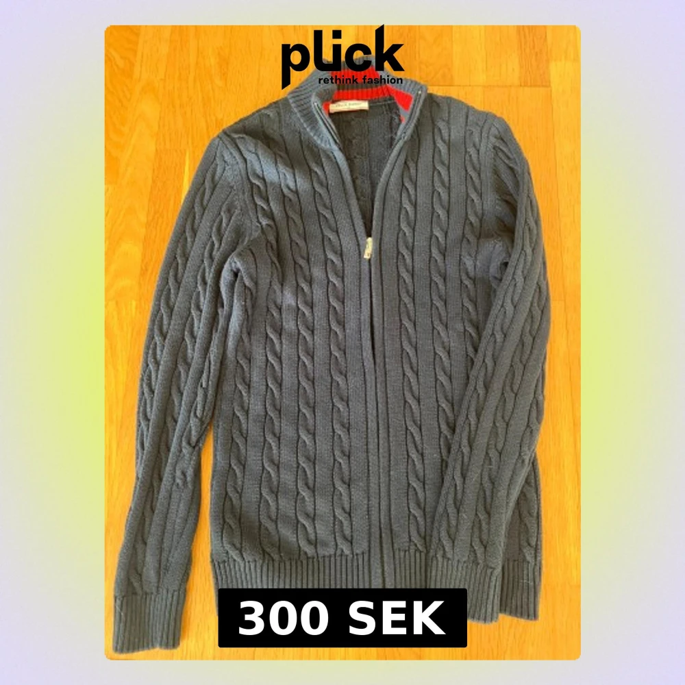 Säljer en mörkblå stickad kofta från Felix Hardy med dragkedja framtill och snyggt kabelstickat mönster. Insidan av kragen har coola röda och mörkblå ränder som ger extra stilpoäng. Perfekt för dig som gillar klassisk men modern look.