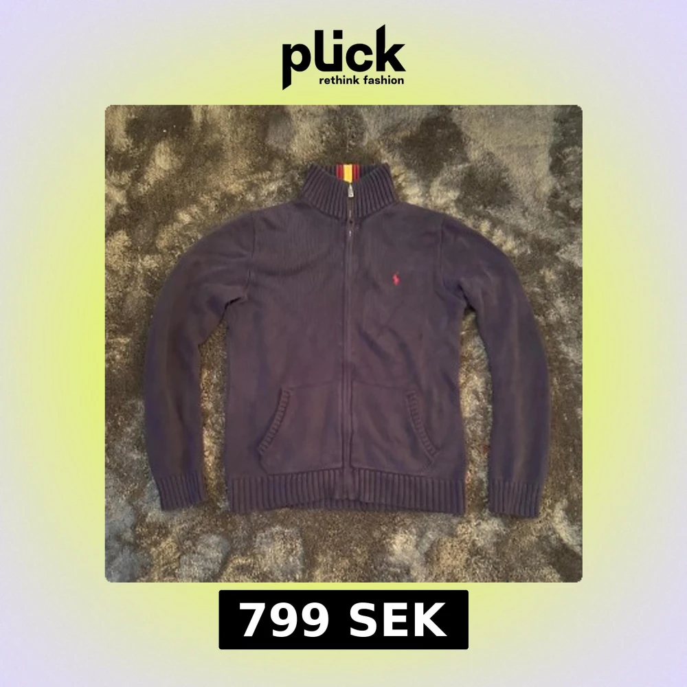 Mörkblå stickad kofta från Polo Ralph Lauren med dragkedja och ribbad krage med röda och gula ränder. Klassisk röd logga broderad på bröstet och två fickor framtill. Perfekt för lager-på-lager under kyliga dagar. Size 18-20 år passar S
