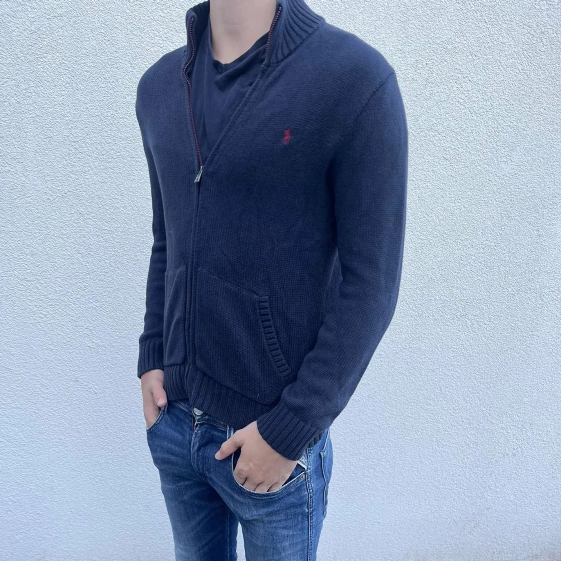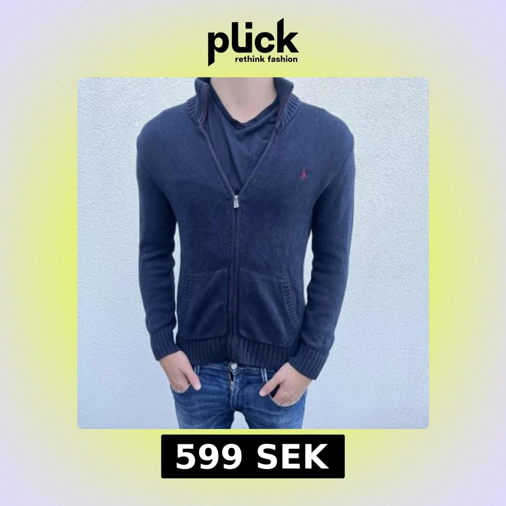Snygg mörkblå stickad kofta från Ralph Lauren med dragkedja och två framfickor. Klassisk röd logga broderad på bröstet och ribbade muddar vid ärmslut och krage. Perfekt för dig som gillar stilren och chill look.