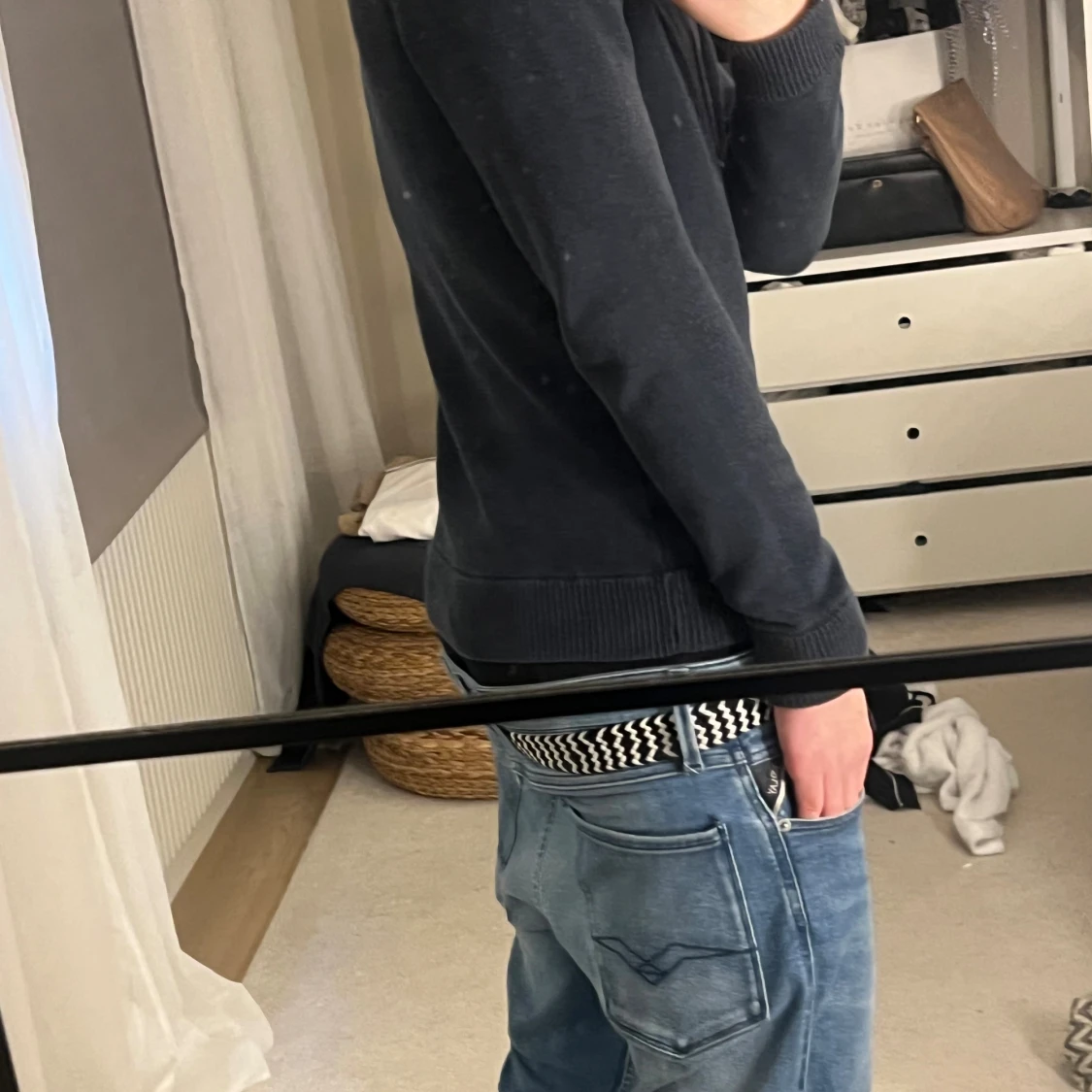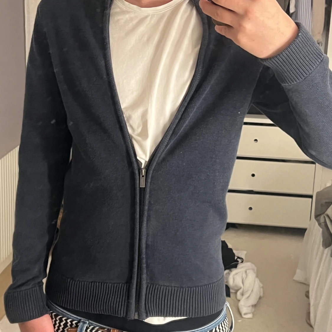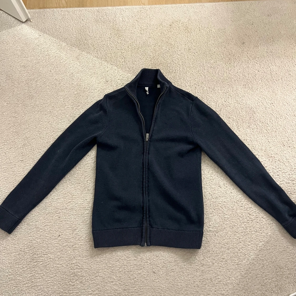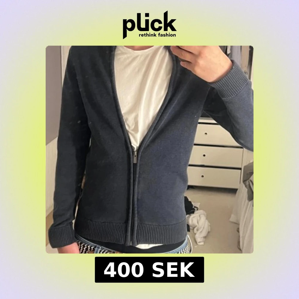 Snygg mörkblå stickad kofta med hel dragkedja framtill och ribbade muddar vid ärmslut och nederkant. Perfekt för lager-på-lager och funkar året runt. Enkel och stilren design som passar till det mesta. Jag är 184 och 72 kg. Tröjan är av märke ”Dobber” och är i storlek S. Skriv om du har frågor eller om du vill diskutera pris!