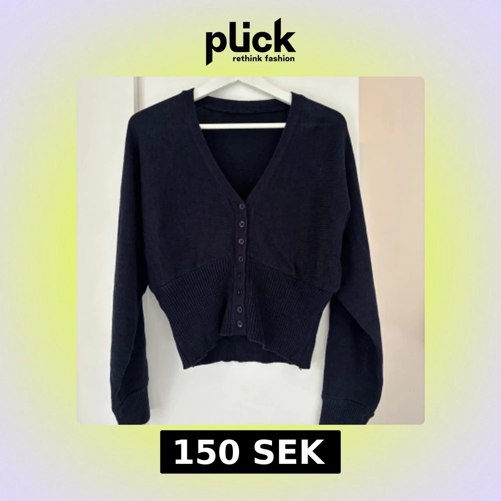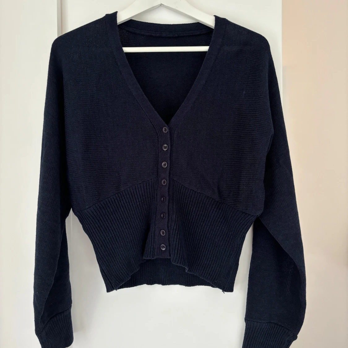 Snygg mörkblå stickad kofta med v-ringning och knappar framtill. Modellen är croppad med ribbad nederkant och muddar vid ärmslut. Perfekt att slänga över en t-shirt eller linne för en chill look.