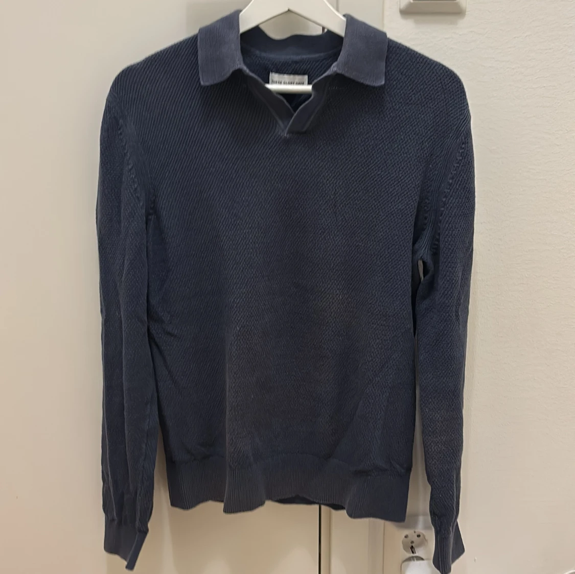Snygg mörkblå stickad pikétröja från These glory days med klassisk krage och lång ärm. Tröjan har diskret struktur i materialet och ribbade muddar vid ärmslut och nederkant. Perfekt för en stilren och avslappnad look.