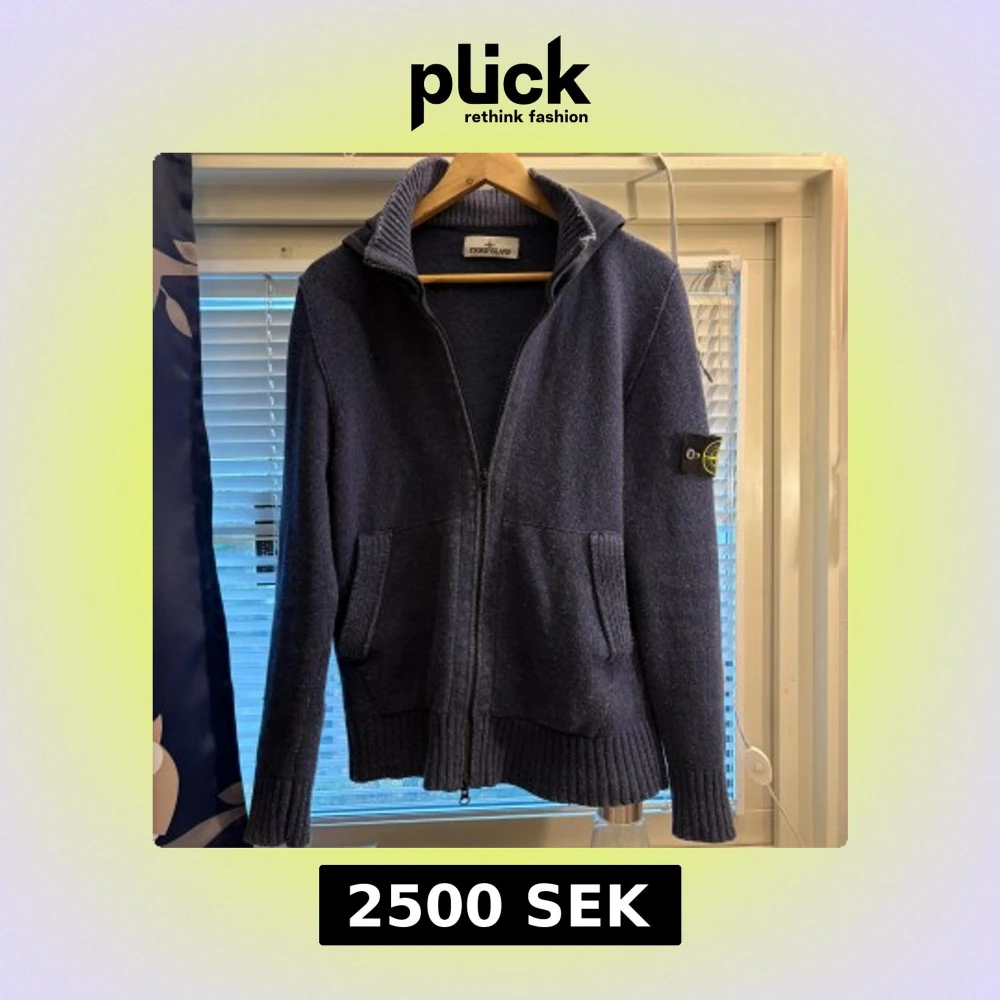 Säljer en mörkblå stickad hoodie från Stone Island med dragkedja och huva. Tröjan har ribbade muddar, två fickor fram och den klassiska loggan på ärmen. Perfekt för lager-på-lager stilen!