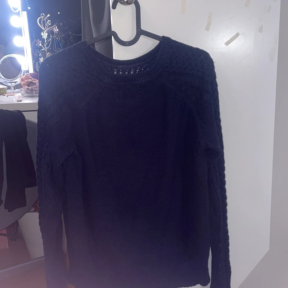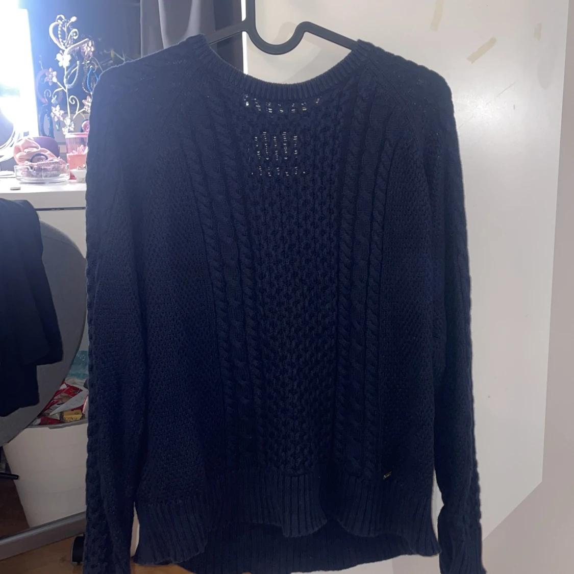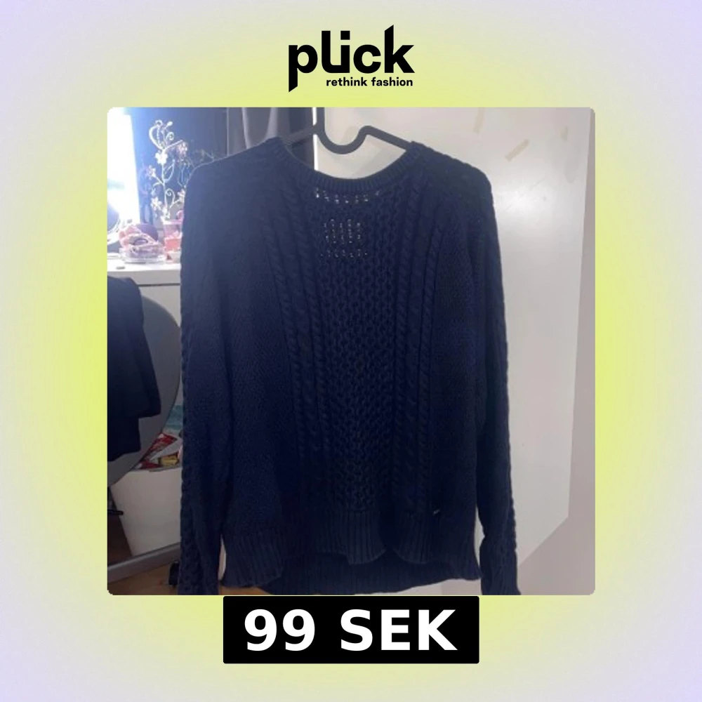Säljer en mysig mörkblå stickad tröja med flätstickat mönster. Tröjan har långa ärmar och en rund halsringning. Perfekt för kyliga dagar!