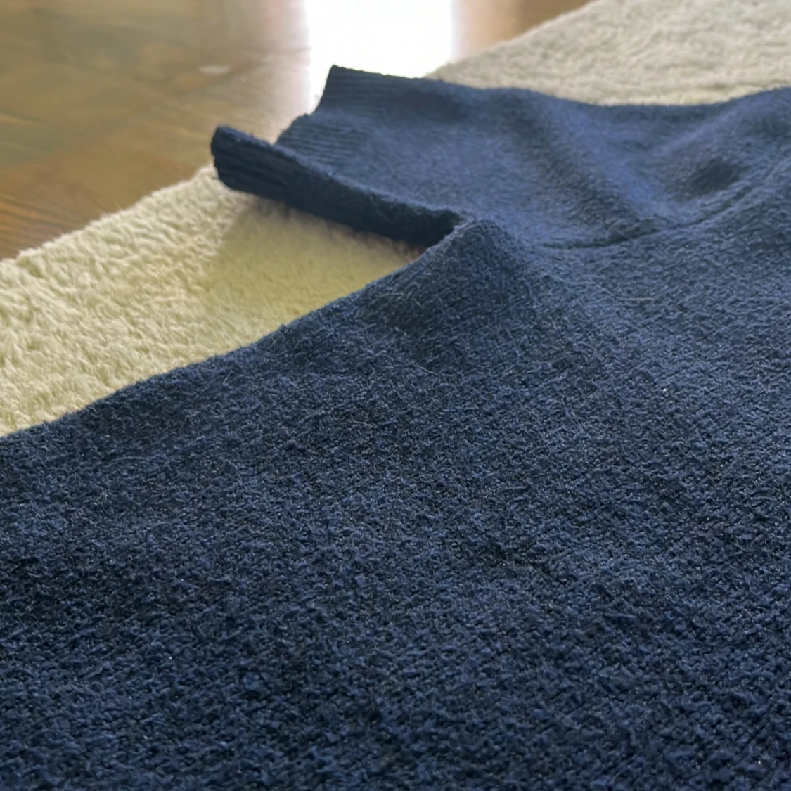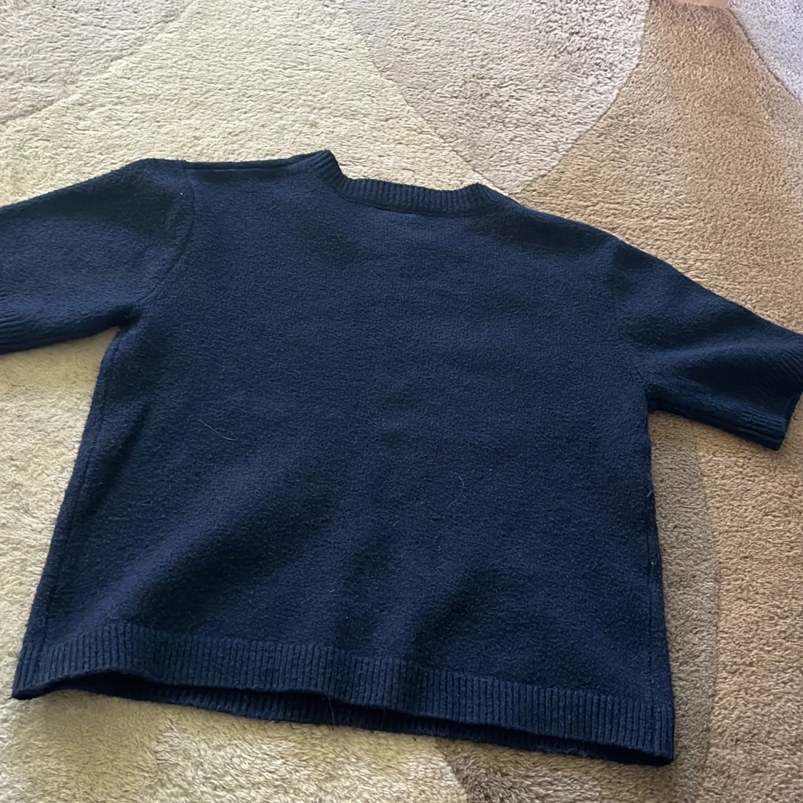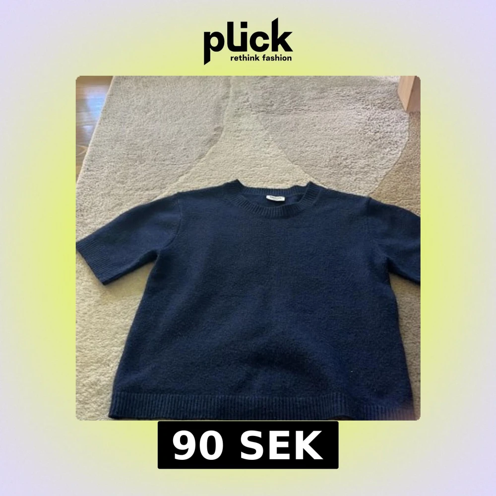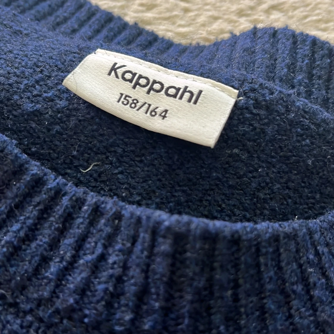 Mörkblå stickad tröja från Kappahl i storlek 158/164. Tröjan har korta ärmar, rund halsringning och ribbade muddar vid ärmslut och nederkant. Tröjan har ett skönt materiall.