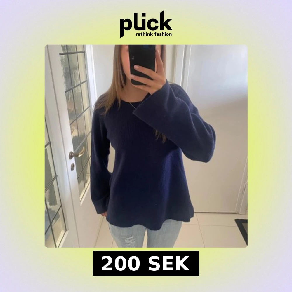 mysig mörkblå stickad tröja med långa och utsvängda ärmar. Tröjan har en avslappnad passform och är superbekväm att bära. Färgen kan se lite olika ut i olika ljus, kolla sista bilden💓