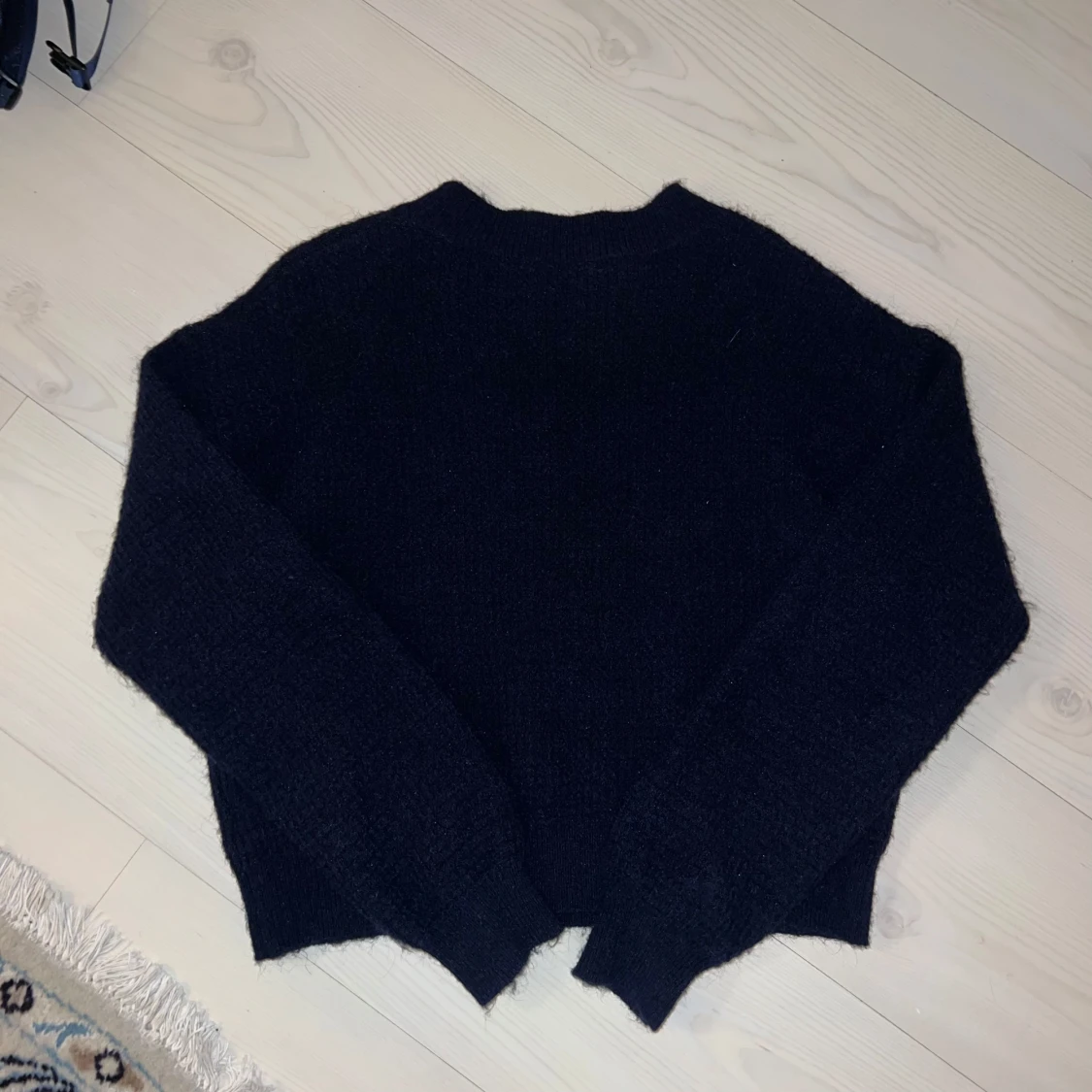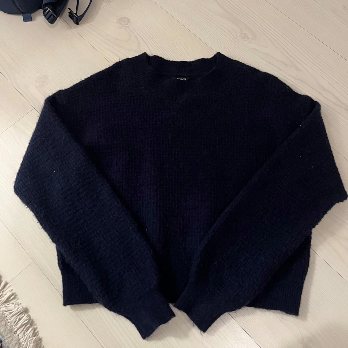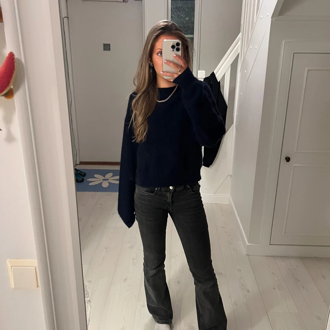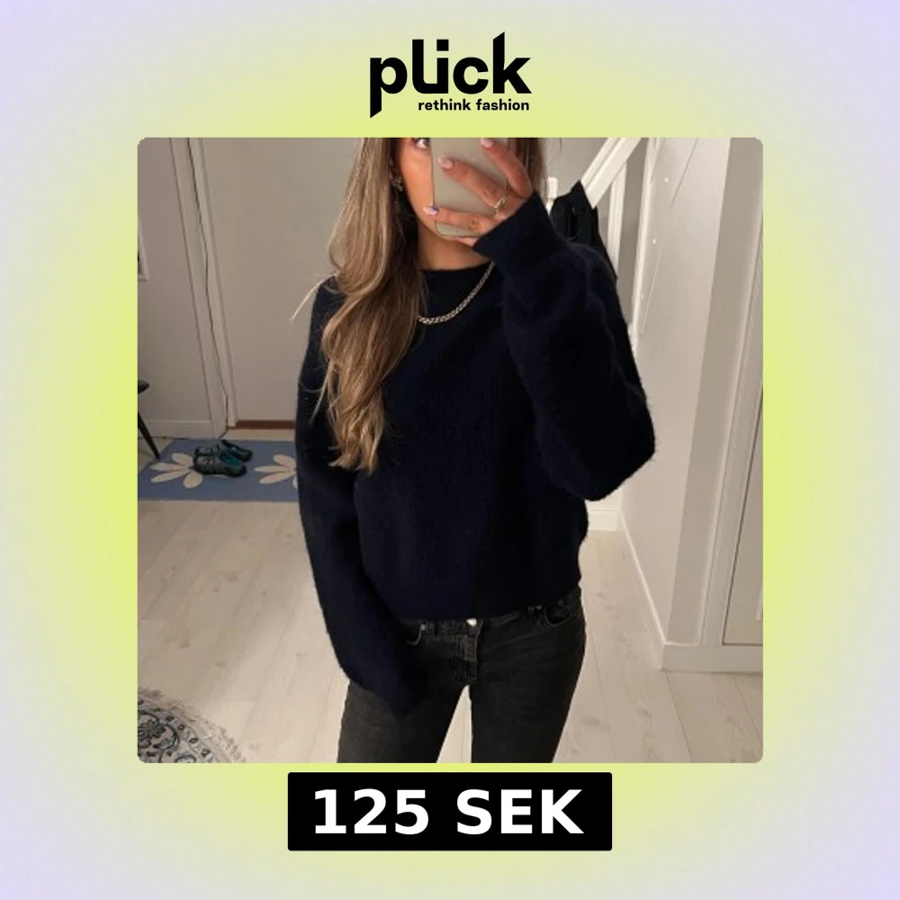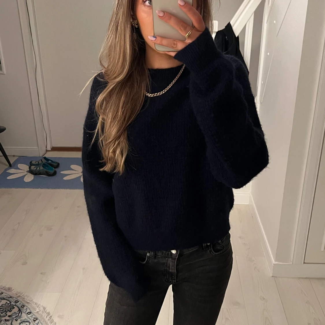 Säljer en mysig mörkblå stickad tröja med långa ärmar. Skönt material. Pris kan alltid diskuteras❤️