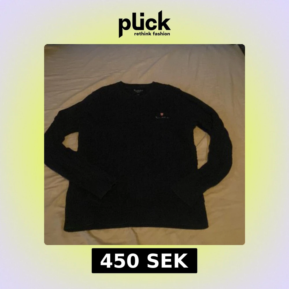Mörkblå stickad tröja från Bondelid i storlek M. Klassisk modell med rund hals och diskret broderad logga på bröstet. Perfekt för lager-på-lager och passar till jeans eller chinos. Skön och mjuk känsla tack vare det stickade materialet.
