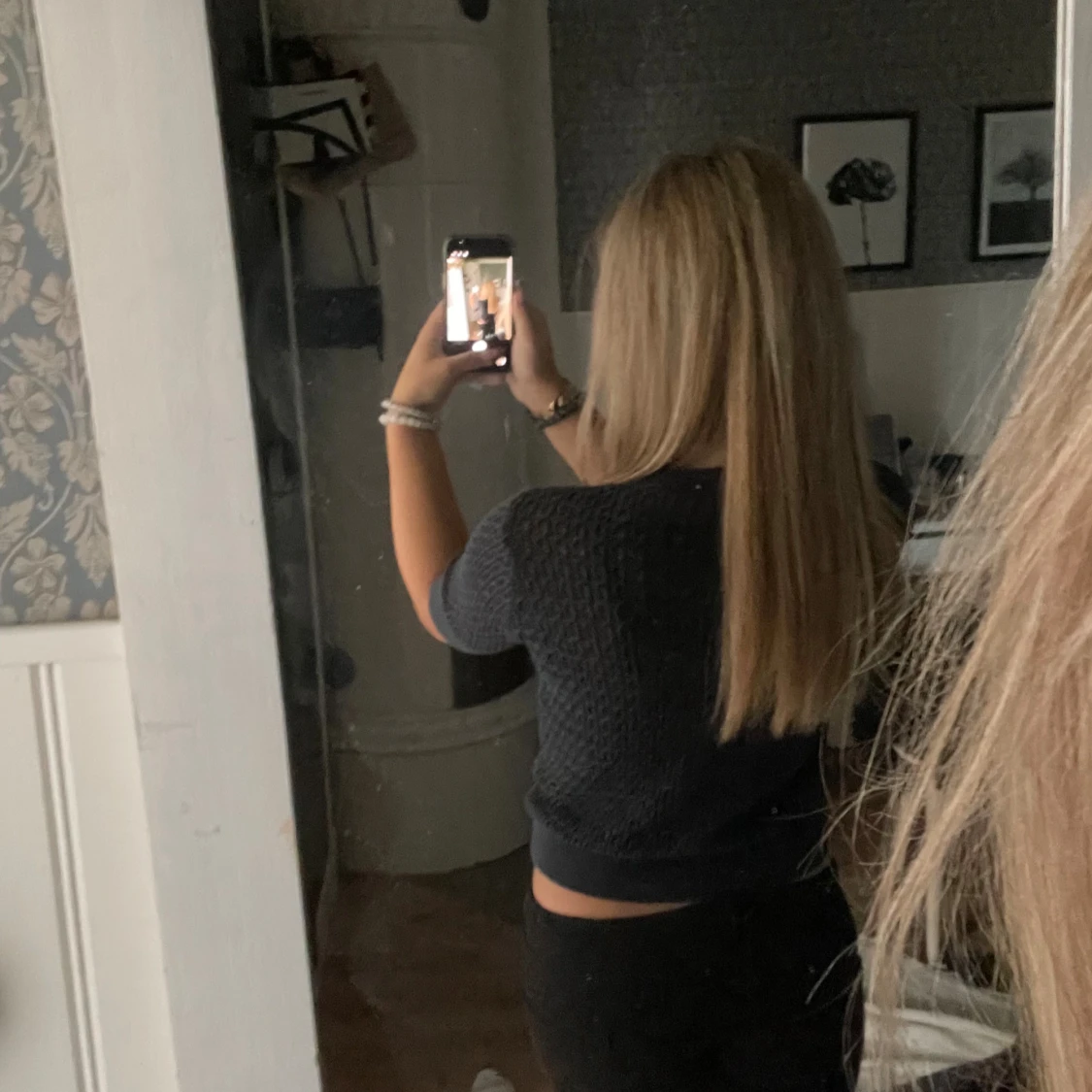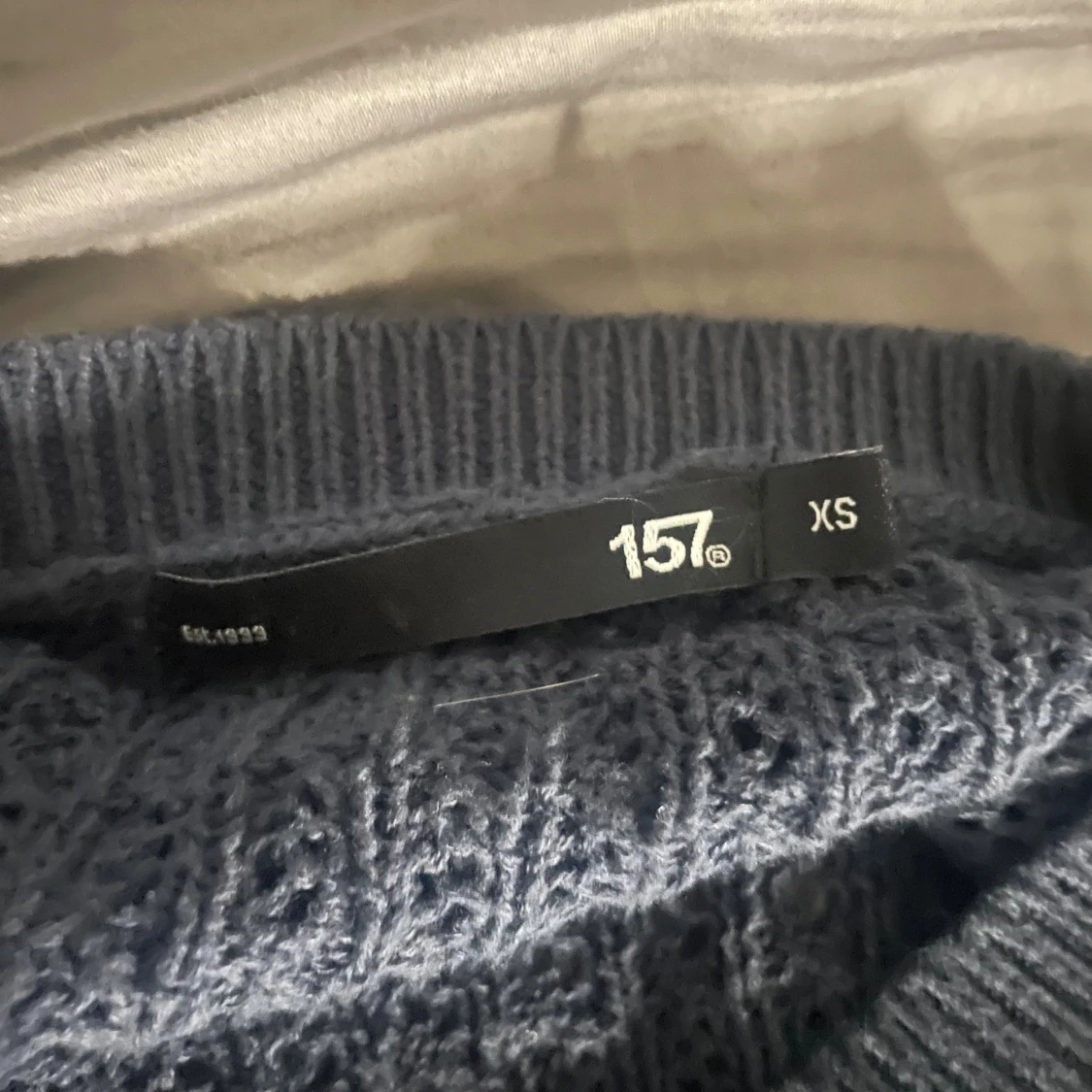 Aldrig använt. Säljer en mörkblå stickad tröja från 157 i storlek XS. Tröjan har korta ärmar och ett snyggt strukturmönster över hela plagget. Ribbstickade muddar vid ärmslut och nederkant.