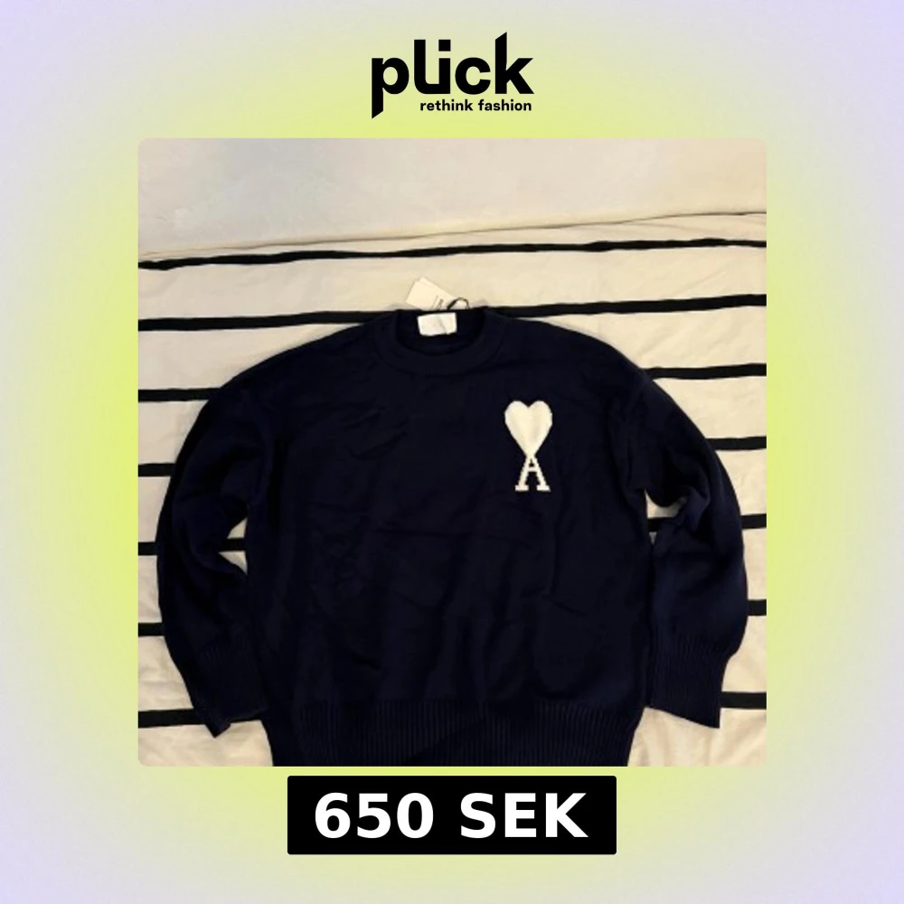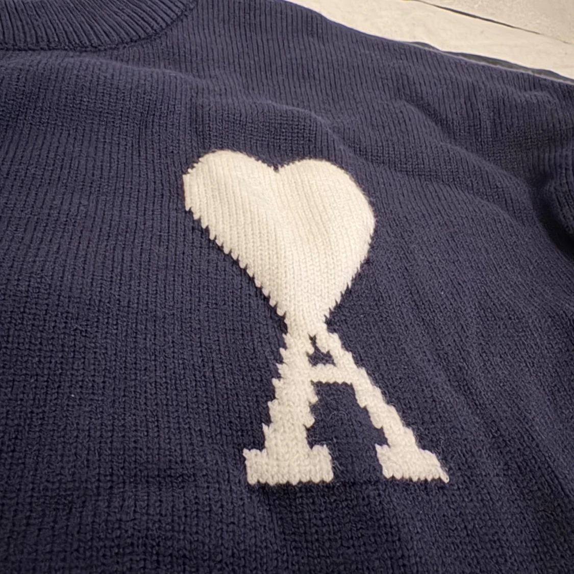 Snygg mörkblå stickad tröja från Ami med rund hals och ribbade muddar. På bröstet finns ett stort vitt hjärta med bokstaven A, som ger en unik och trendig vibe. Perfekt för dig som gillar stilrena detaljer och vill sticka ut lite extra. Hör av dig om du har några frågor.