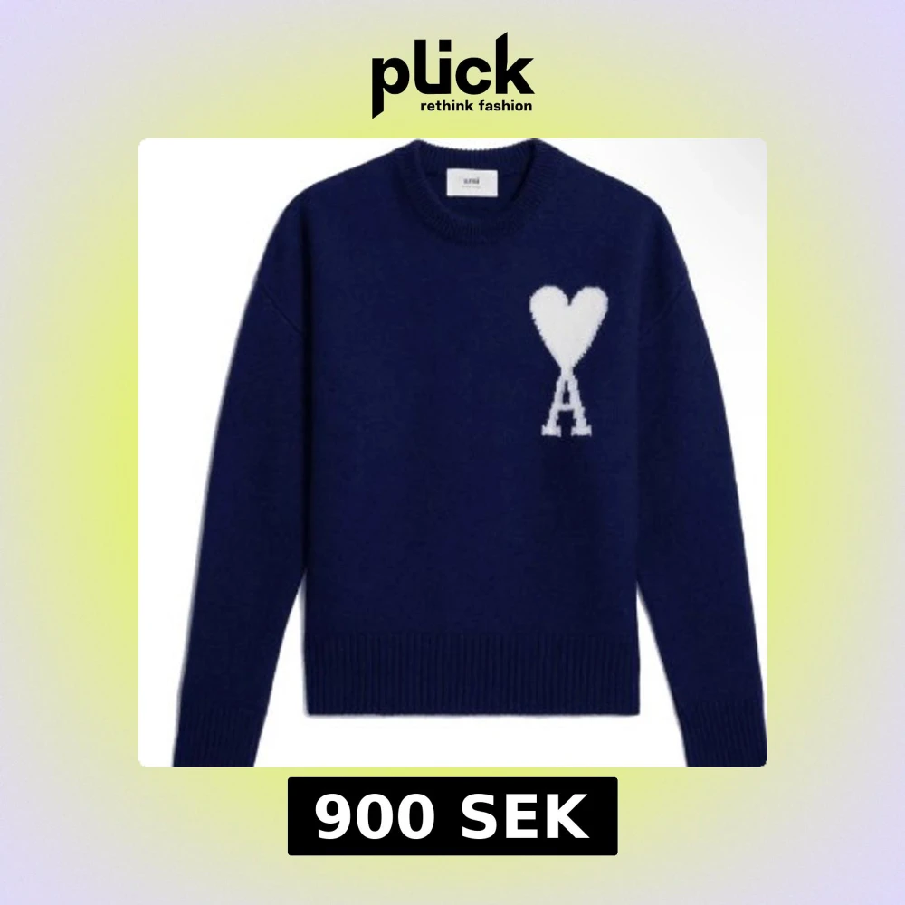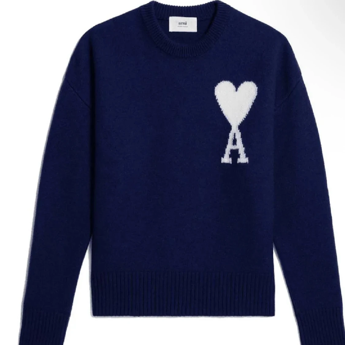Säljer en mörkblå stickad tröja från Ami med ett stort vitt hjärta och bokstaven A på bröstet. Tröjan har rund hals, ribbade muddar och lång ärm. Perfekt för dig som gillar stilrena plagg med en twist.