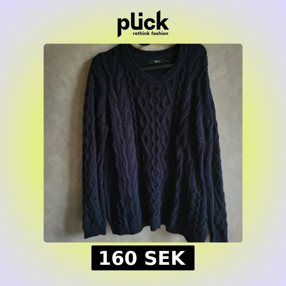 Säljer en snygg mörkblå stickad tröja från Ellos med ett klassiskt flätmönster. Tröjan har långa ärmar och en rund halsringning, perfekt för kyligare dagar. Passar bra till både jeans och kjol.