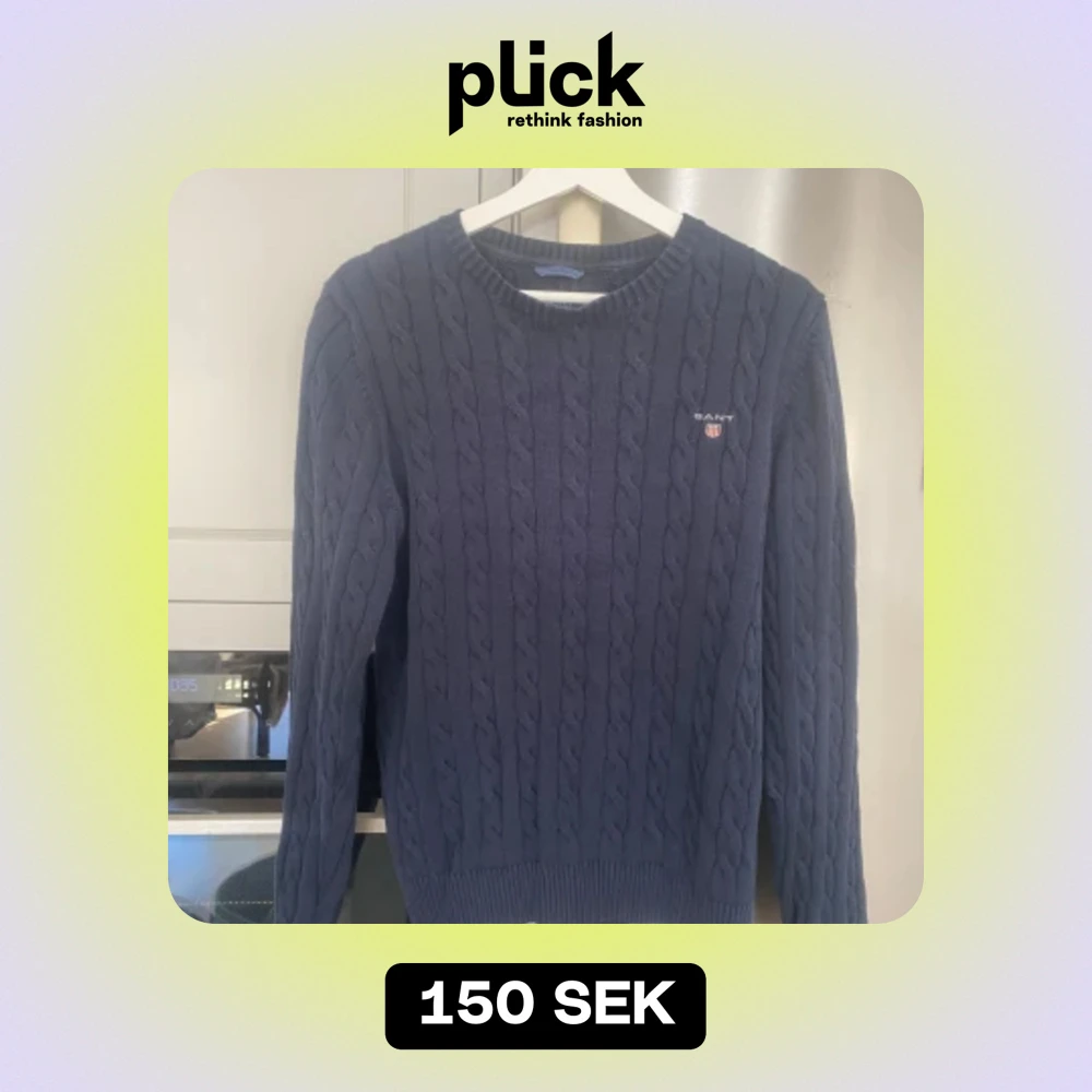 Säljer en snygg och stilren mörkblå stickad tröja från GANT. Tröjan har ett klassiskt kabelstickad mönster och är gjord av bomull. Okej men använt skick. Perfekt för höst och vinter.