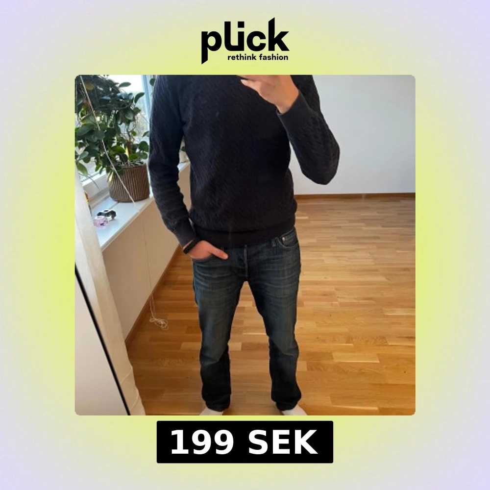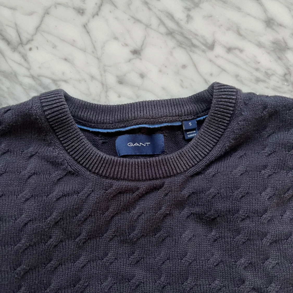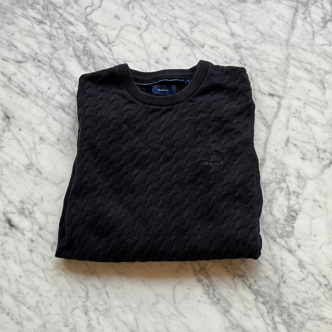 Säljer en stilren mörkblå stickad tröja från GANT. Tröjan har ett diskret mönster och rund halsringning. Perfekt för kyligare dagar och passar bra till både jeans och chinos. Ett måste i garderoben för den som gillar klassisk stil.