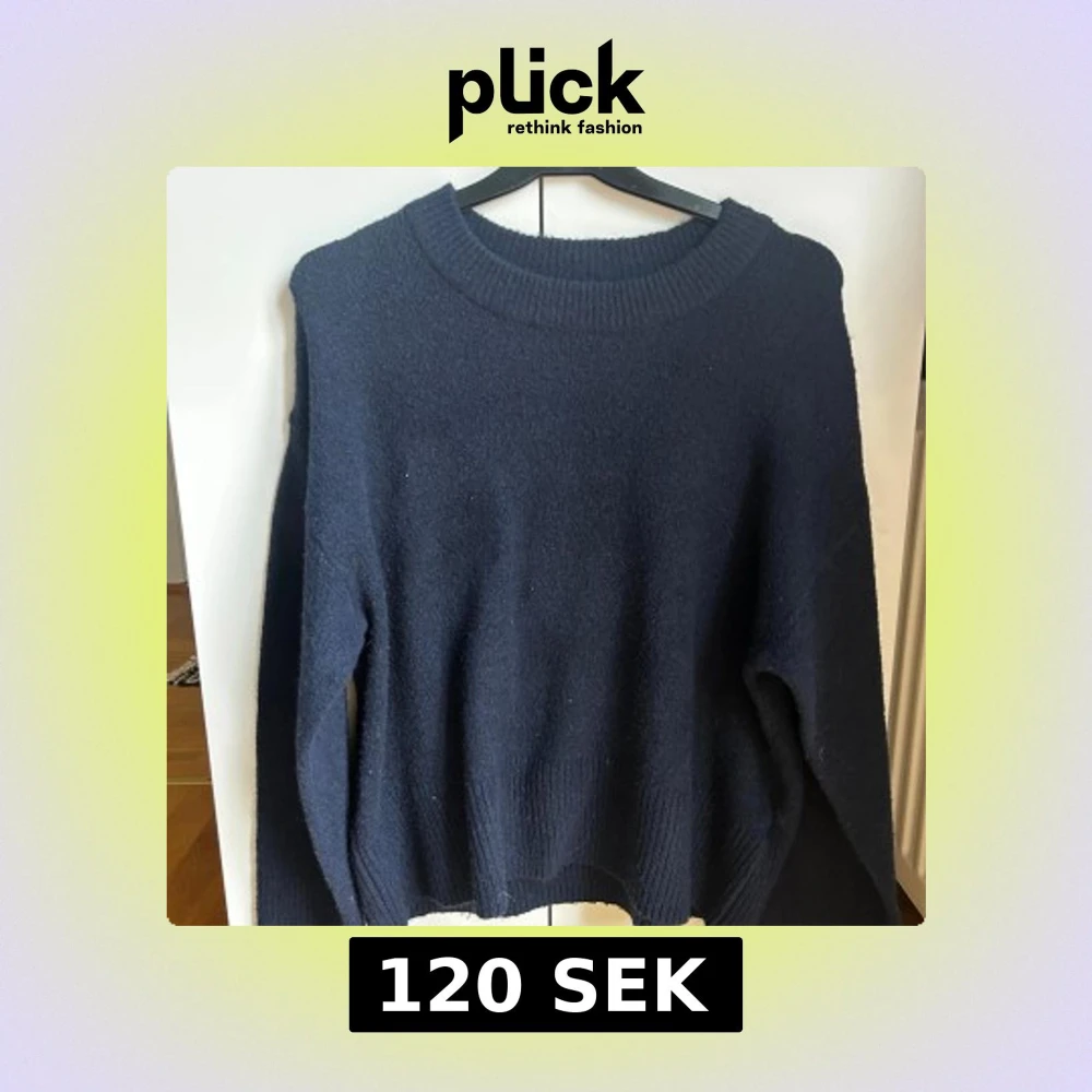 Mysig mörkblå stickad tröja från Gina Tricot Young med rund halsringning och ribbade muddar vid ärmslut och nederkant. Den är aldrig använd! Skriv gärna ifall ni vill ha fler bilder🥰