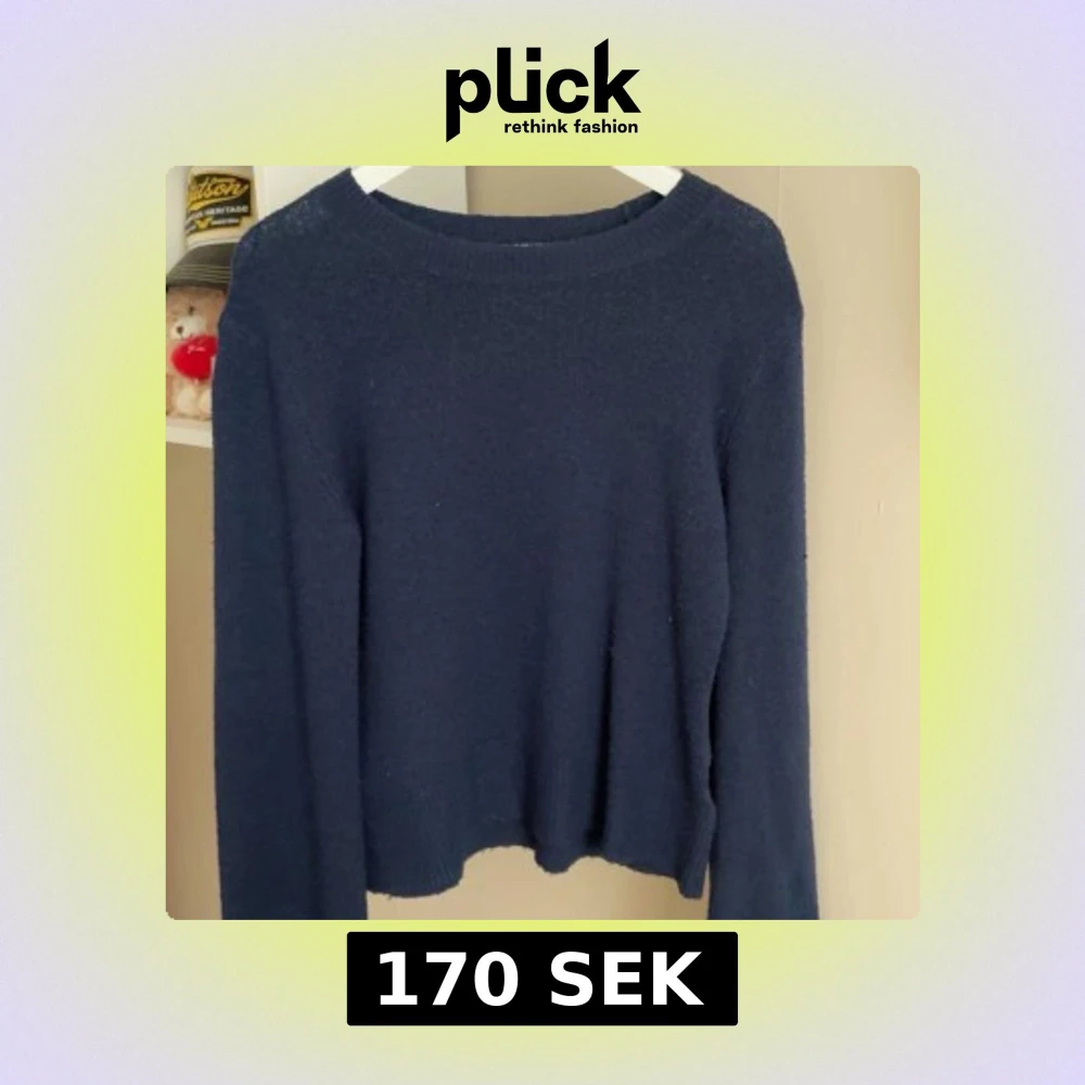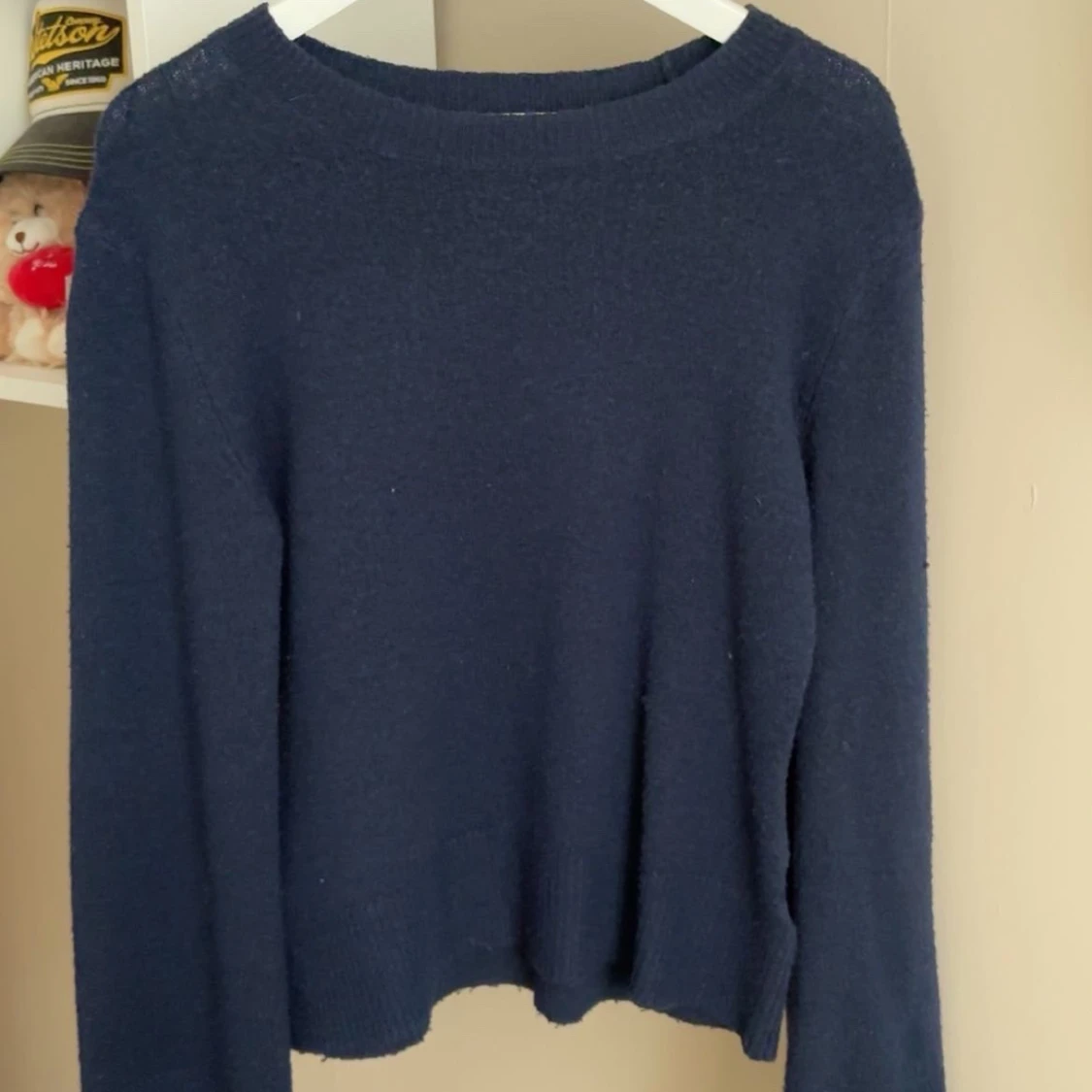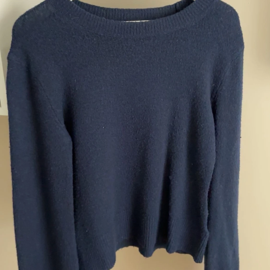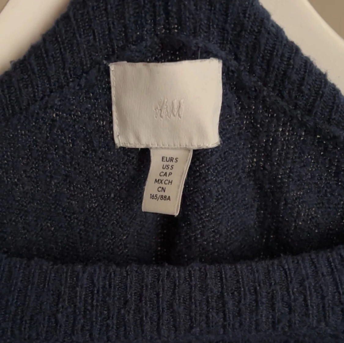 En enkel och stilren mörkblå stickad tröja från H&M. Tröjan har rund halsringning, långa ärmar och ribbade muddar vid ärmslut och nederkant.
