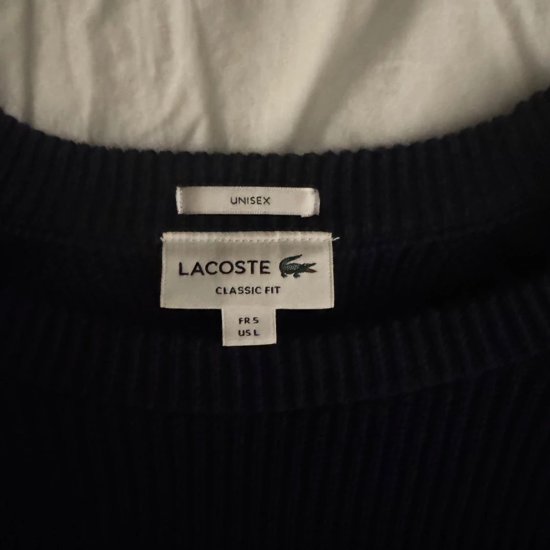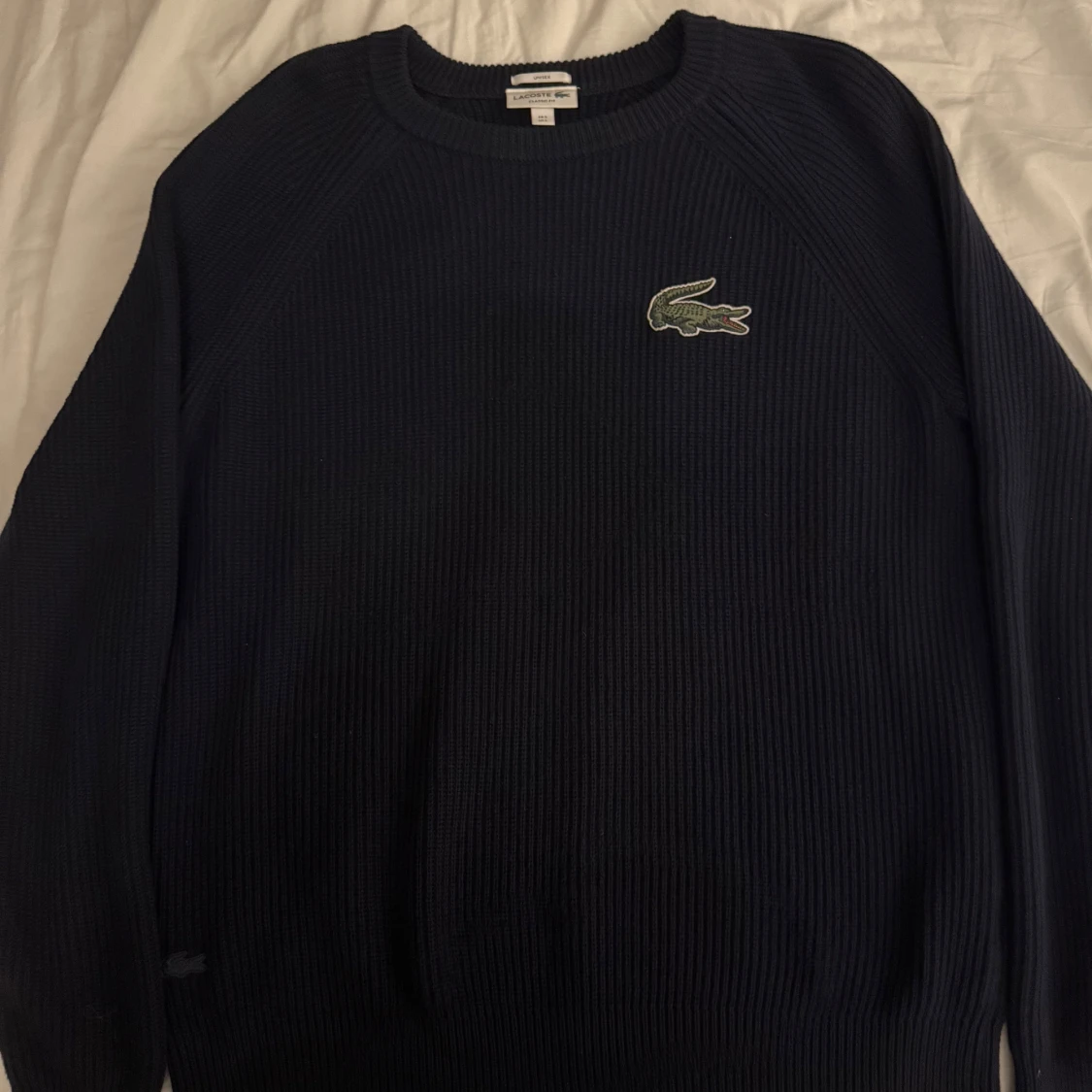 Säljer en mörkblå stickad tröja från Lacoste med klassisk passform. Tröjan har långa ärmar och det ikoniska Lacoste-märket på bröstet. Priset kan diskuteras. Och nej det är inte en fläck på den. Bara skuggan
