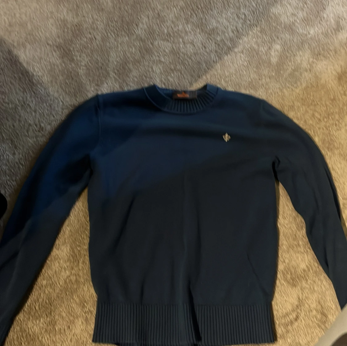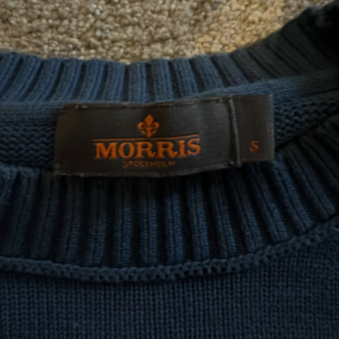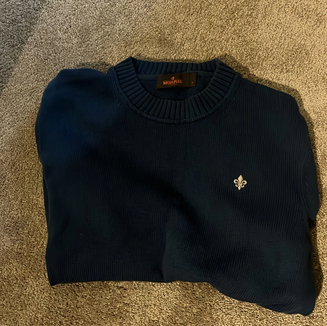 Snygg mörkblå stickad tröja från Morris med rund halsringning och diskret logga broderad på bröstet. Tröjan har ribbade muddar vid ärmslut och nederkant, perfekt för dig som gillar klassisk och stilren look.