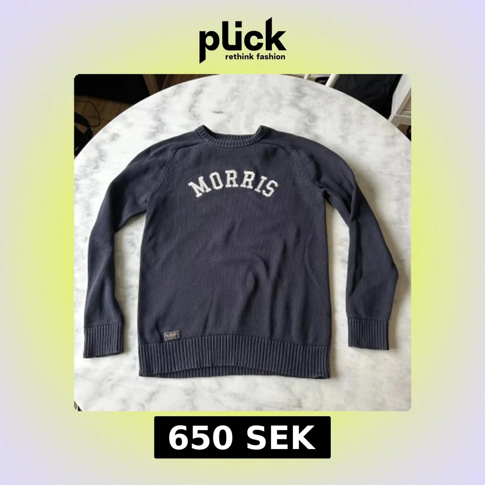 Säljer en mörkblå stickad tröja från Morris Gents med vit text på bröstet. Tröjan har rund halsringning, långa ärmar och ribbade muddar vid ärmslut och nederkant. Perfekt för en stilren och avslappnad look. Fint använd skick.