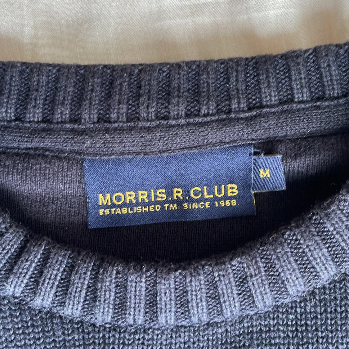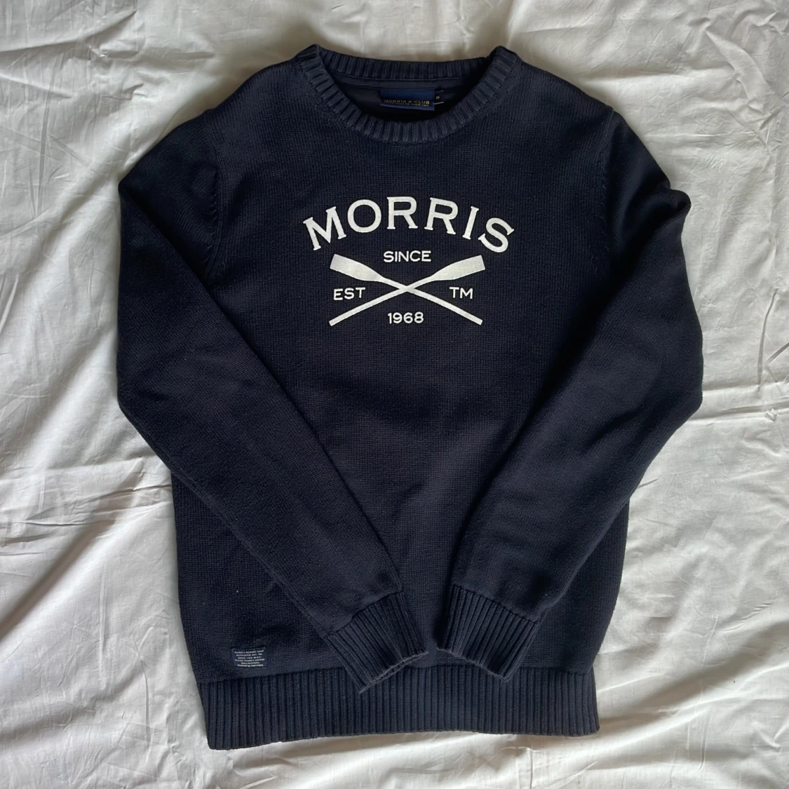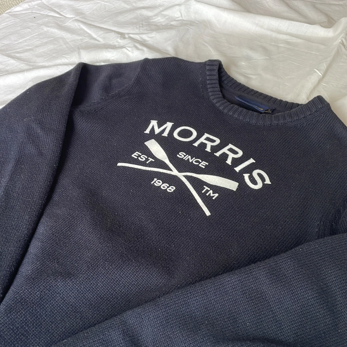 Säljer en mörkblå stickad tröja från Morris med vit logga och tryck framtill. Tröjan har rund halsringning och långa ärmar, samt ribbade muddar vid ärmslut och nederkant. Perfekt för en stilren och avslappnad look.