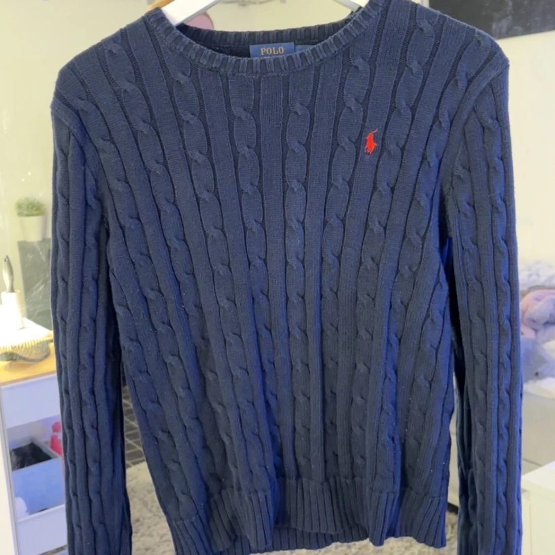 Snygg mörkblå stickad tröja från Polo Ralph Lauren med kabelstickat mönster och röd logga på bröstet. Tröjan har långa ärmar och rund halsringning. Perfekt för kyliga dagar!