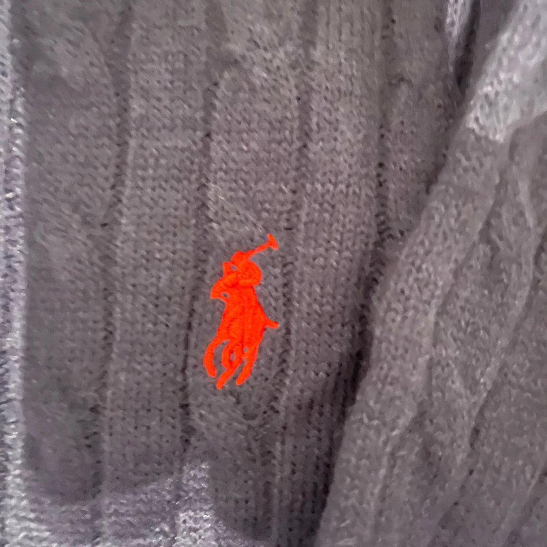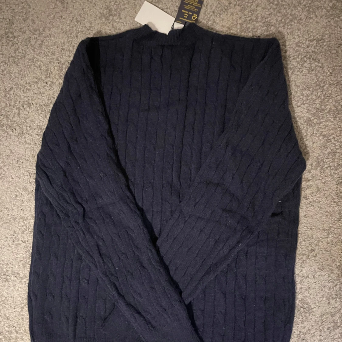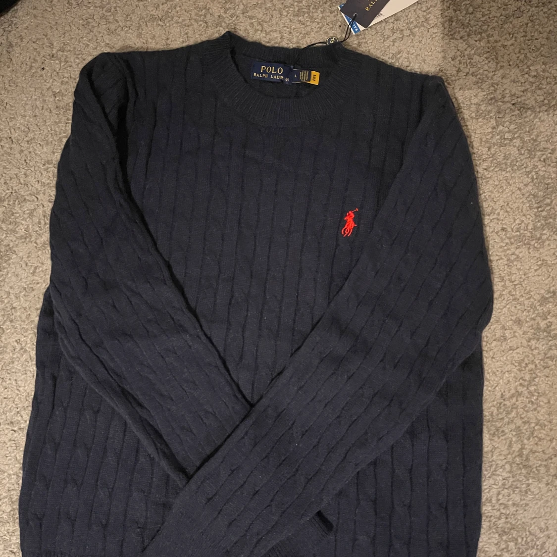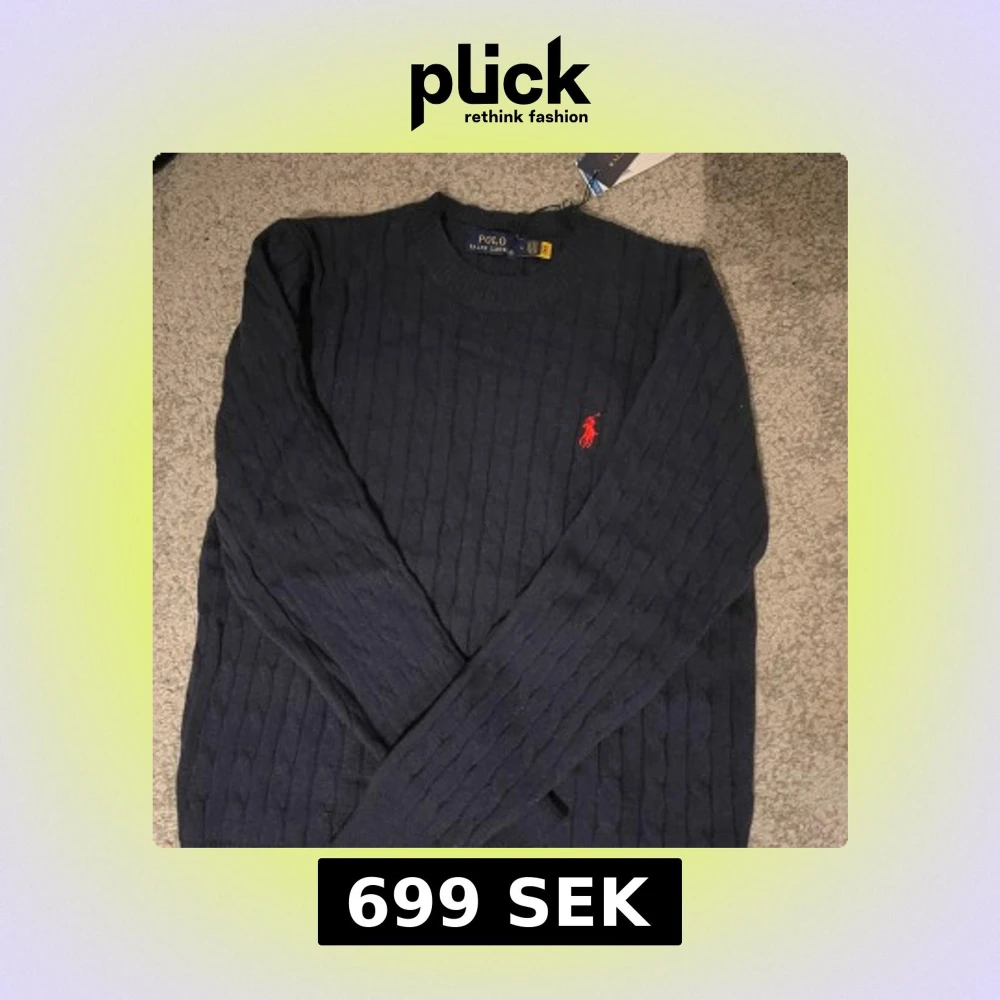 Säljer en snygg mörkblå stickad tröja från Polo Ralph Lauren med det klassiska röda logotypbroderiet på bröstet. Tröjan har en rund halsringning och långa ärmar. Perfekt för en stilren look.