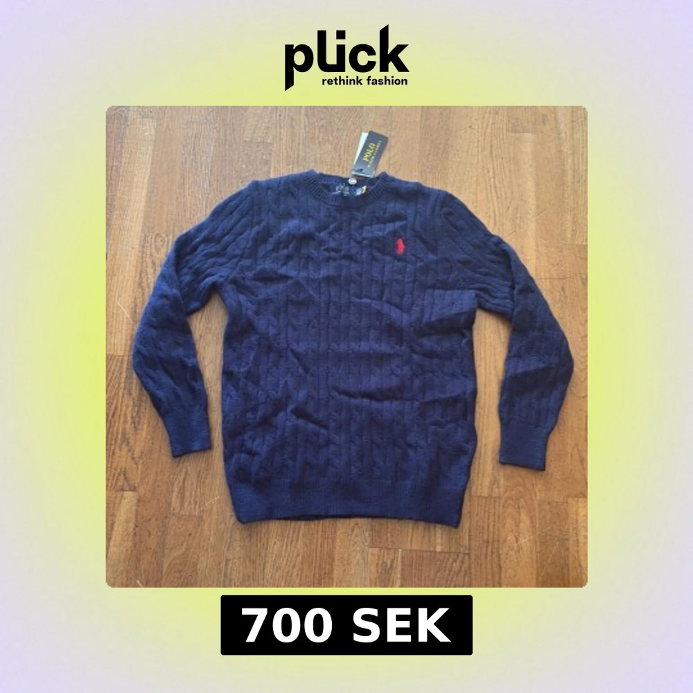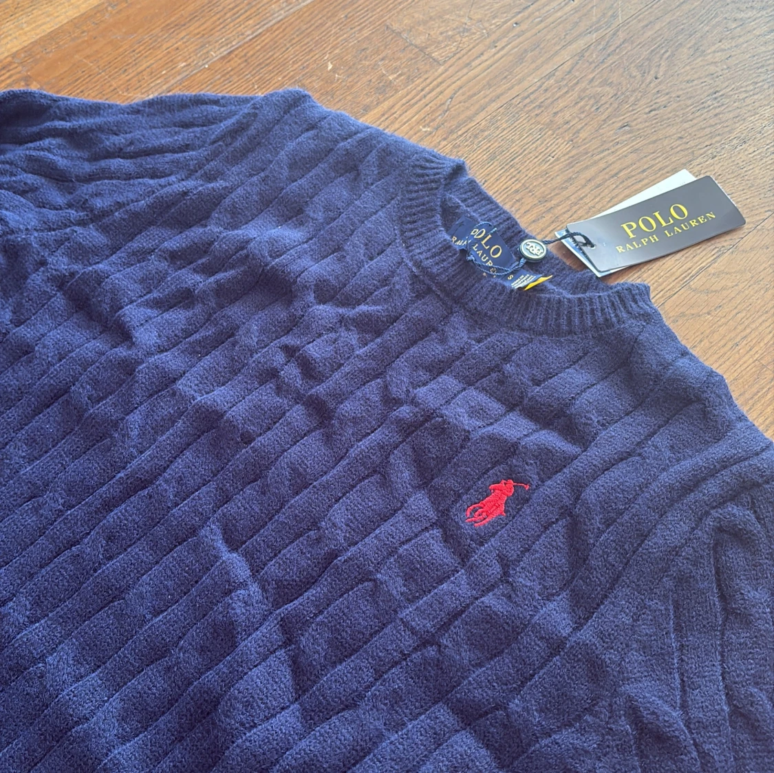 Säljer en mörkblå stickad tröja från Polo Ralph Lauren med klassiskt kabelstickat mönster och röd broderad logga på bröstet. Tröjan har rund halsringning och långa ärmar, perfekt för lager-på-lager under kyliga dagar.