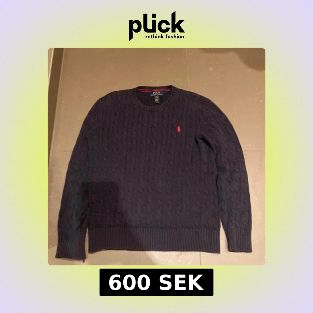 Säljer en snygg mörkblå stickad tröja från Ralph Lauren med kabelstickat mönster. Tröjan har långa ärmar och en rund halsringning. Den ikoniska röda loggan är broderad på bröstet. Perfekt för kyliga dagar och kall sommar kväller, priset går såklart även att diskutera och skriv gärna vid frågor