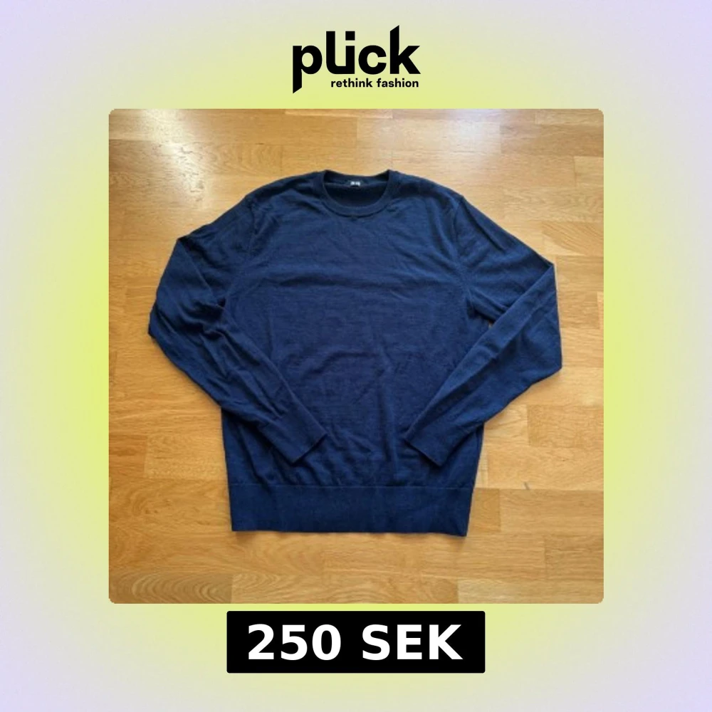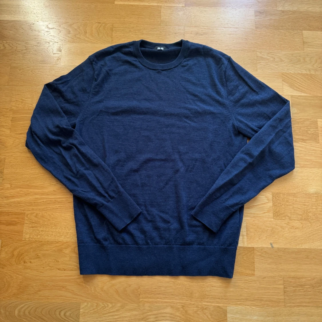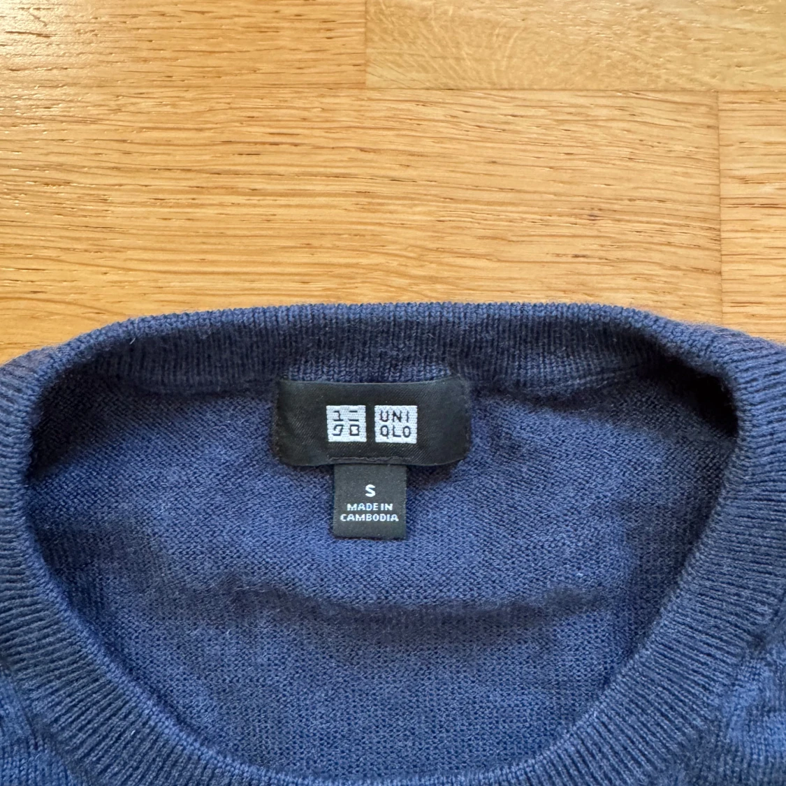En stilren mörkblå stickad tröja från Uniqlo i storlek S. Tröjan har rund halsringning, långa ärmar och ribbade muddar vid ärmslut och nederkant. Perfekt för lager-på-lager och enkel att matcha med jeans eller chinos.