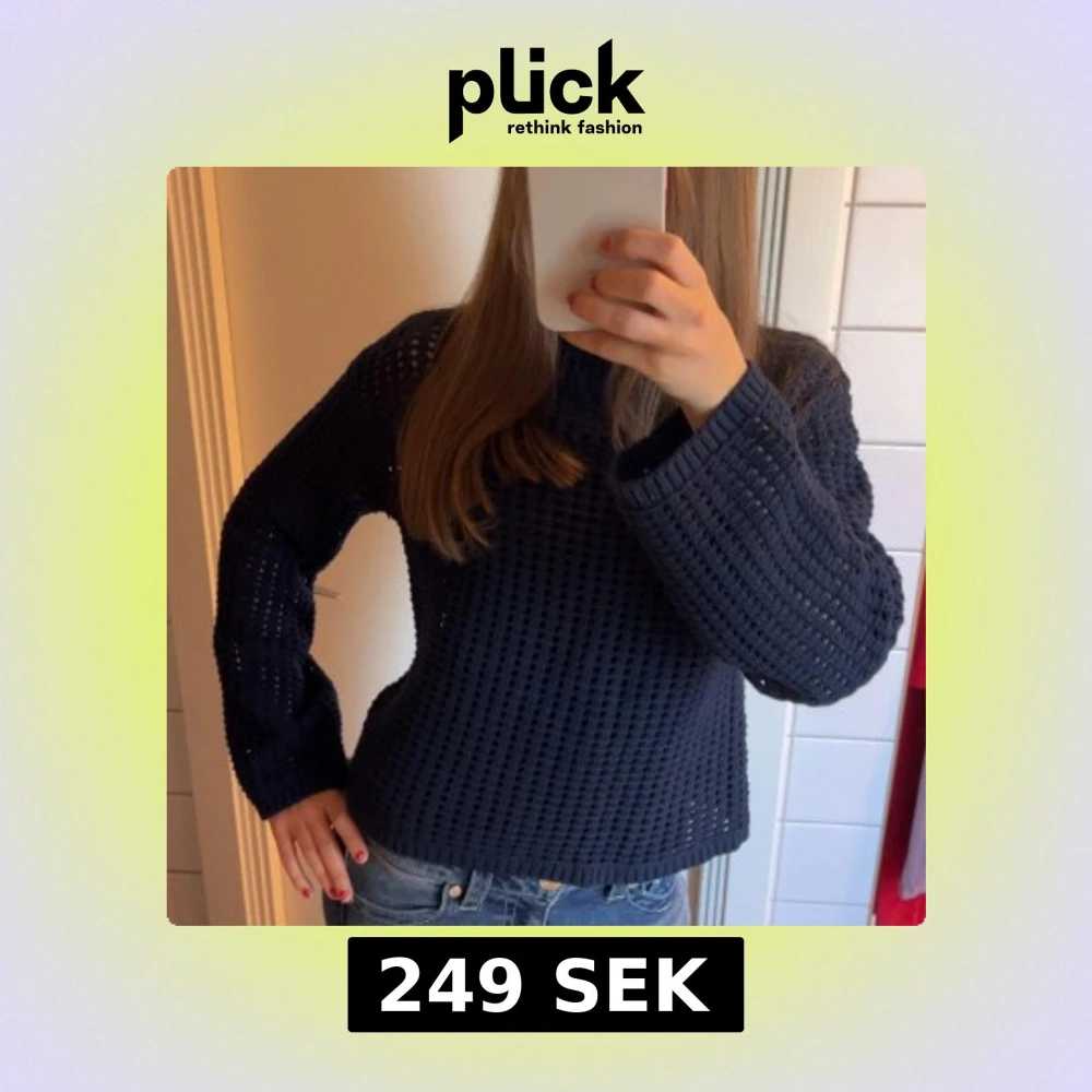 Säljer en mörkblå stickad tröja från Holly White i storlek XS. Tröjan har ett grovmaskigt, håligt mönster och är långärmad med ribbade muddar. Perfekt för lager-på-lager. (Har linne under tröjan på bilden). Säljer då tröjan blivit för liten
