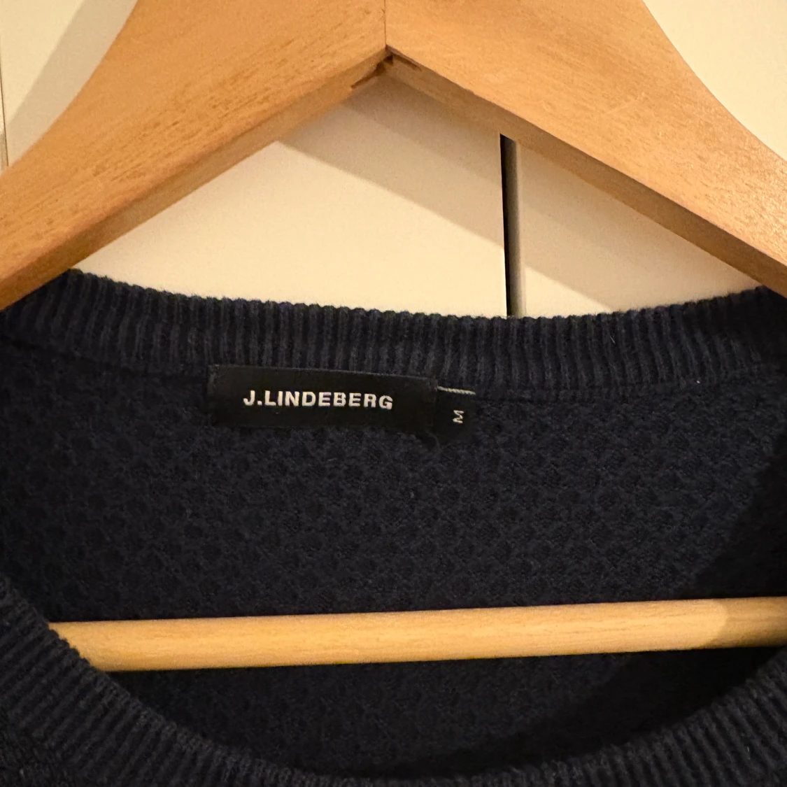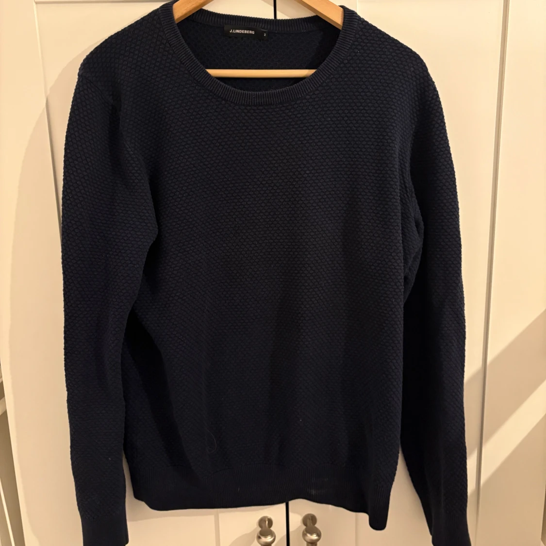 Snygg mörkblå stickad tröja från J.Lindeberg i storlek M. Tröjan har en rund halsringning och ett diskret strukturerat mönster i materialet. Perfekt för lager-på-lager. Pris kan diskuteras!