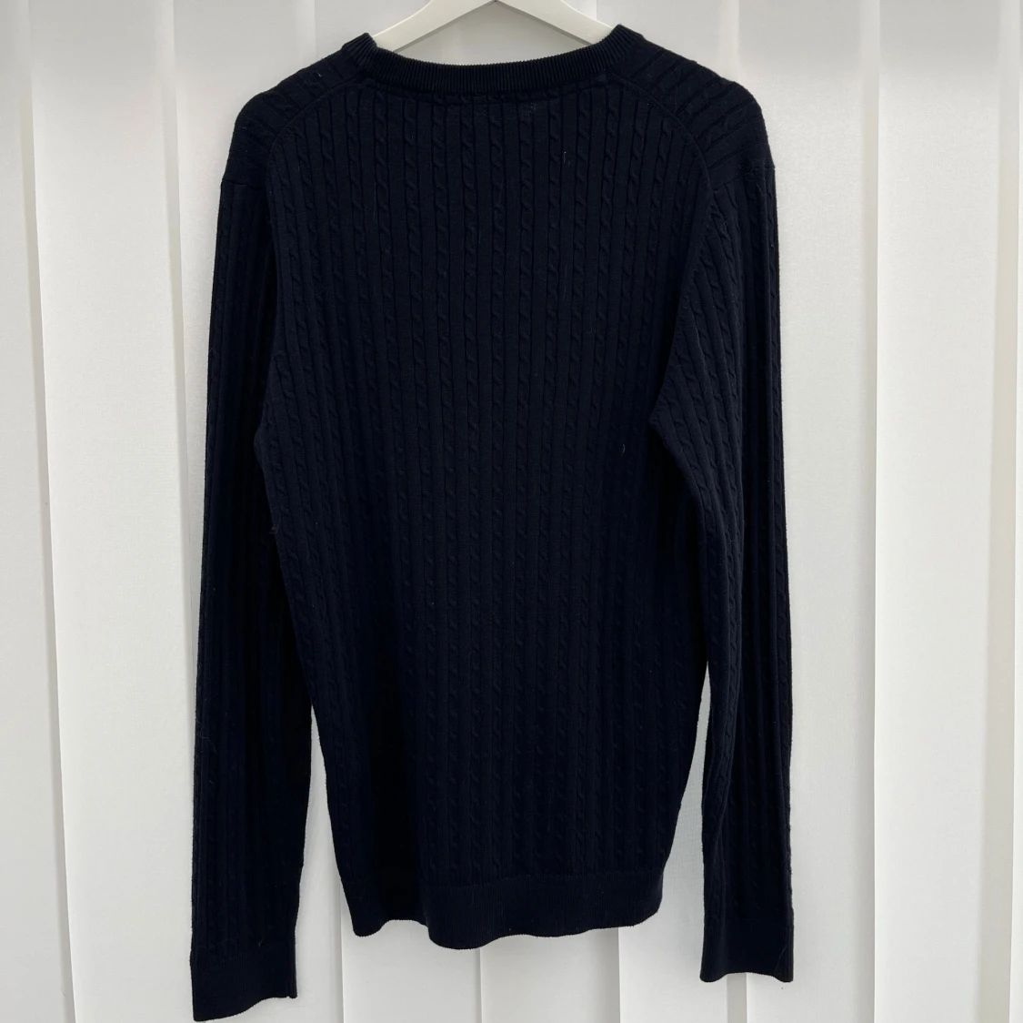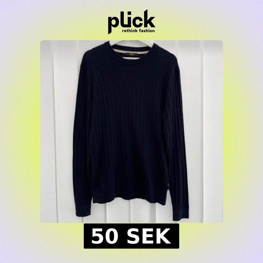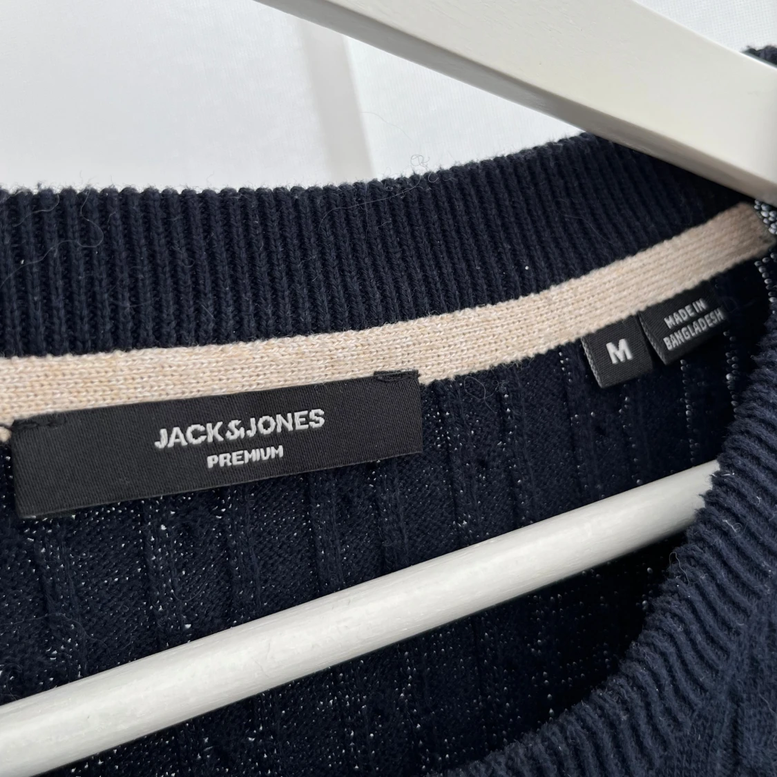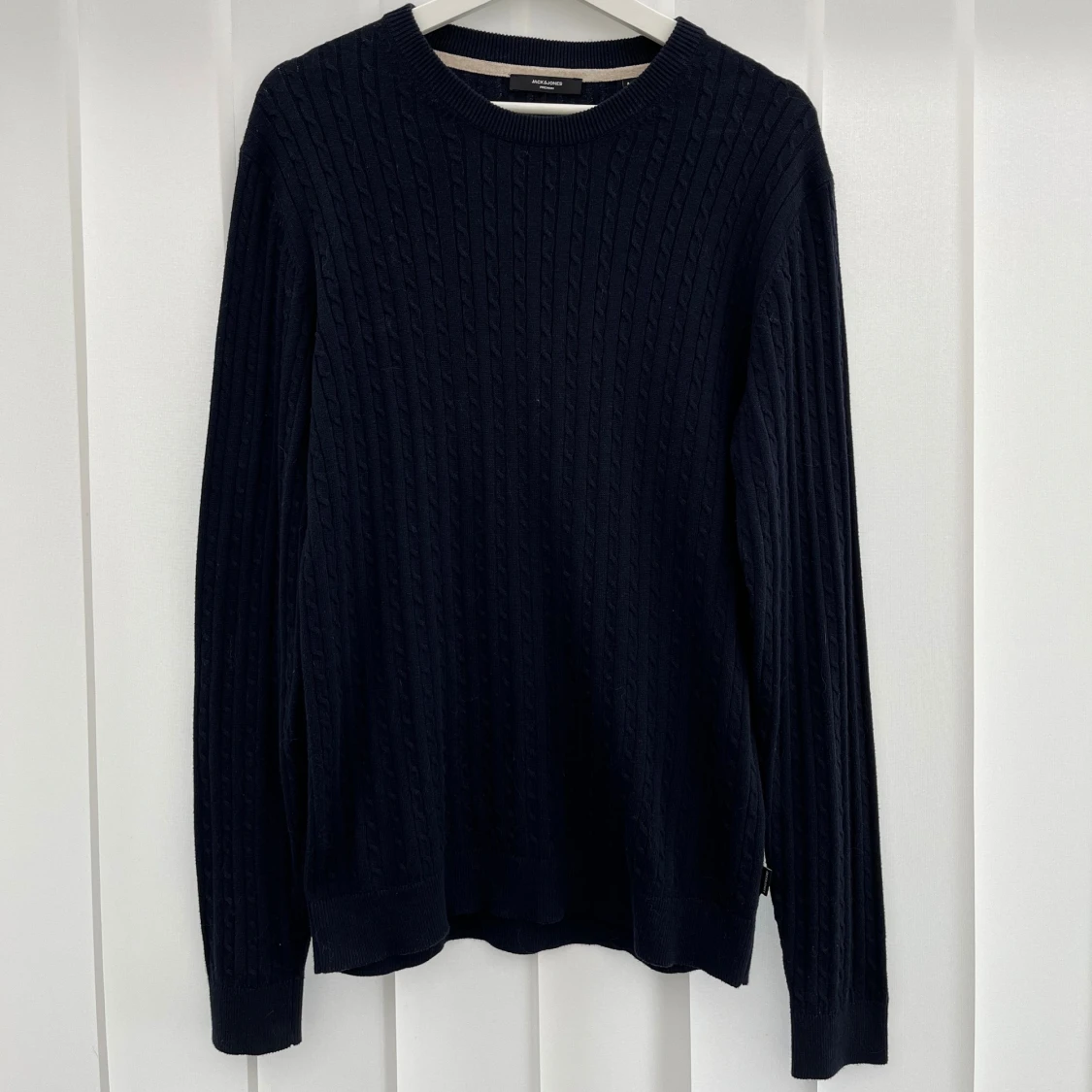 Säljer en mörkblå stickad tröja från Jack & Jones Premium. Tröjan har ett klassiskt kabelstickat mönster, rund halsringning och långa ärmar. Perfekt för dig som gillar en stilren och enkel look med lite struktur i materialet.