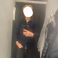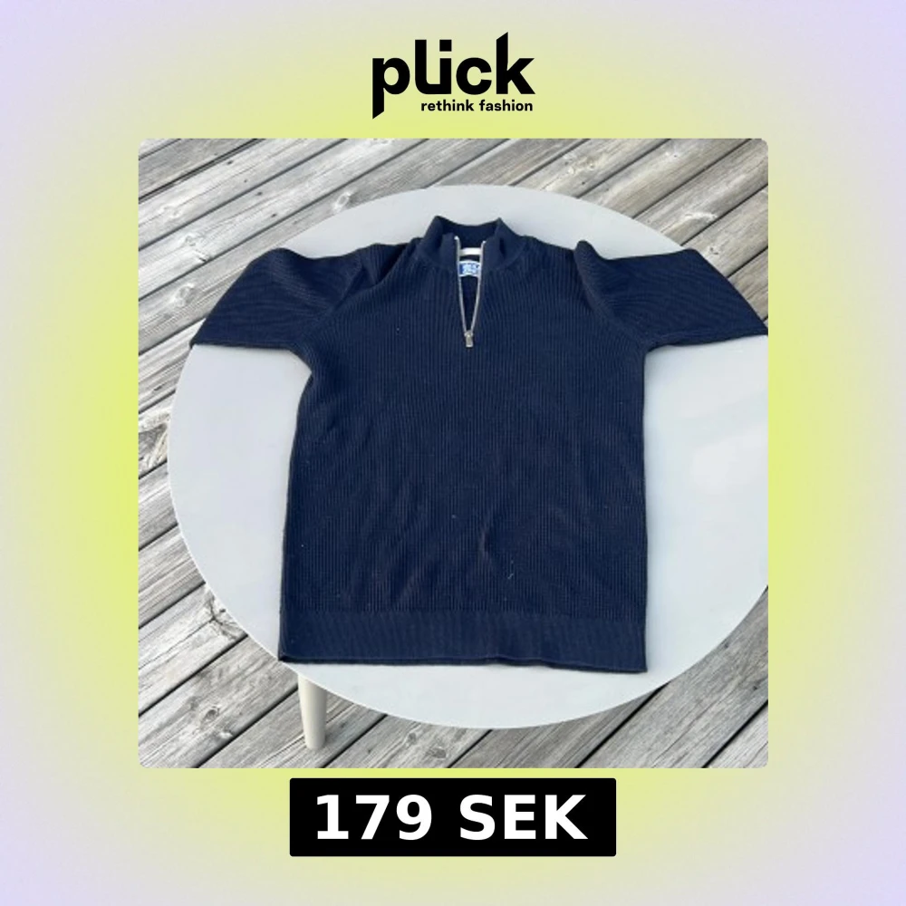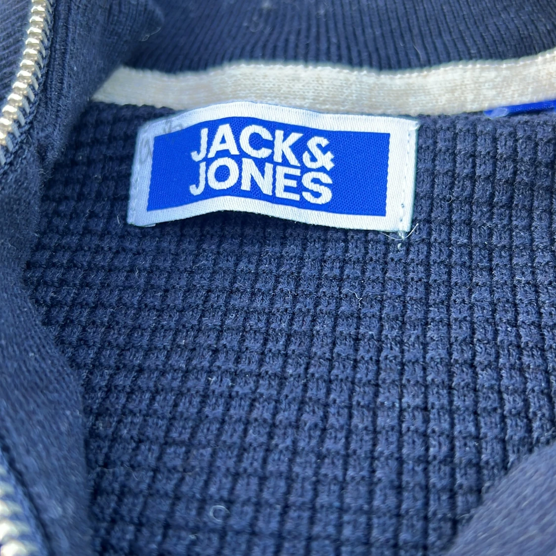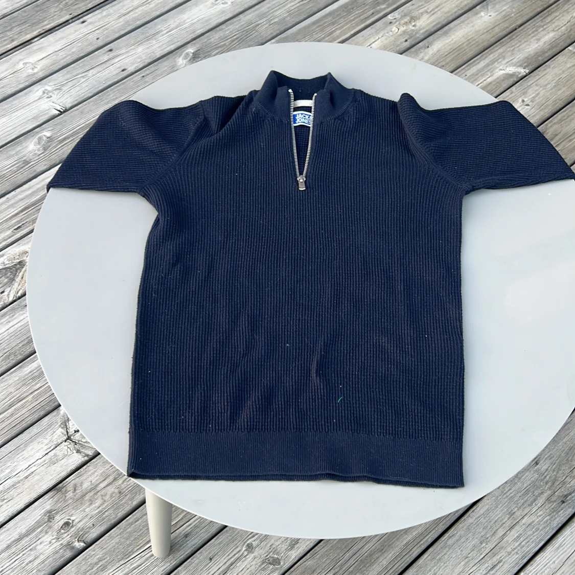 Mörkblå stickad tröja från Jack & Jones med halv dragkedja framtill och ståkrage.. Perfekt för våren/ sommaren. Använd en två gånger. Ny pris 399kr mitt pris 179kr men pris går att diskutera. Passar ca 155 cm.