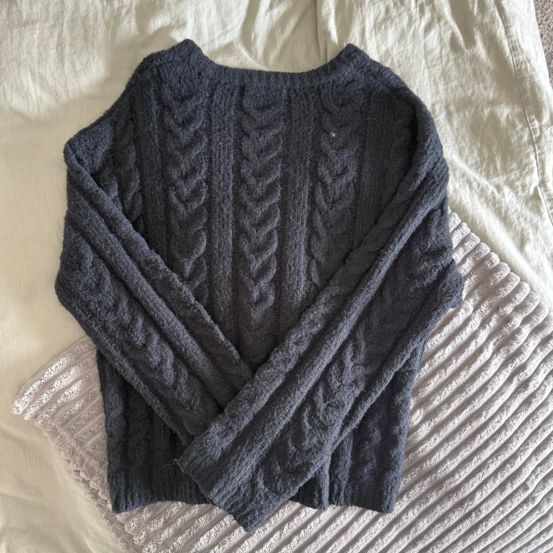 Mysig mörkblå stickad tröja med klassiskt flätmönster över hela plagget. Tröjan har rund halsringning och långa ärmar, perfekt för kyliga dagar. Den är mjuk och passar dig som gillar en enkel men ändå stilren look.